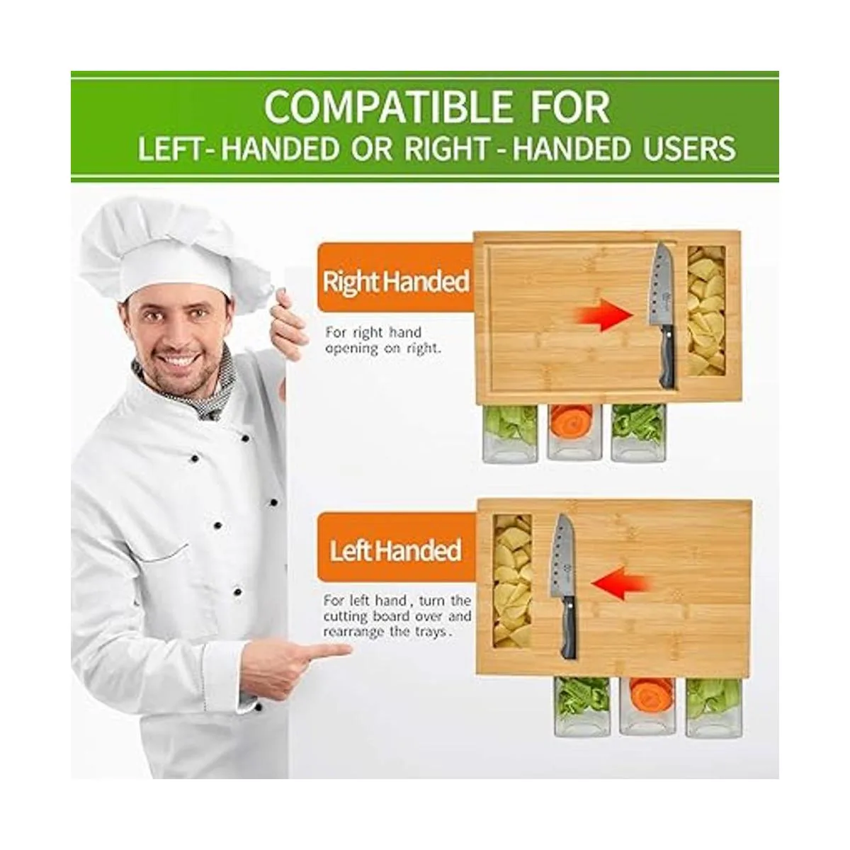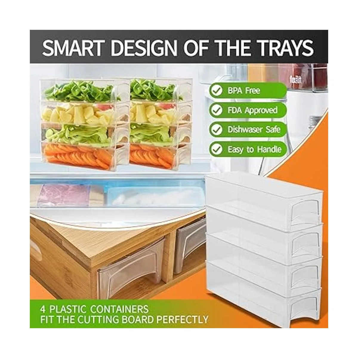 Gran espacio de almacenamiento: la tabla de cortar con bandejas está diseñada para cortar queso, carne, vegetales o para preparar platos. Después de picar los alimentos, deslízalos hacia la bandeja a través de la gran apertura. Con estas bandejas podrás cortar todo tipo de alimentos sin ensuciar la encimera.