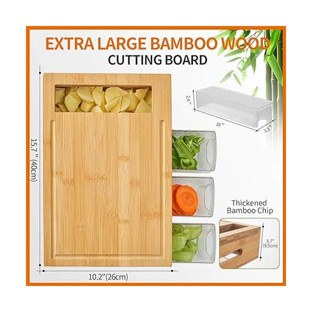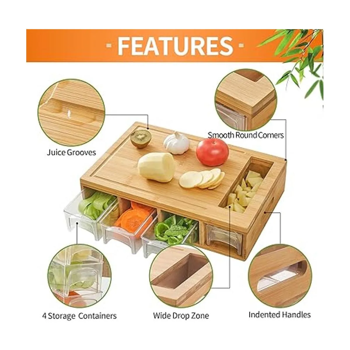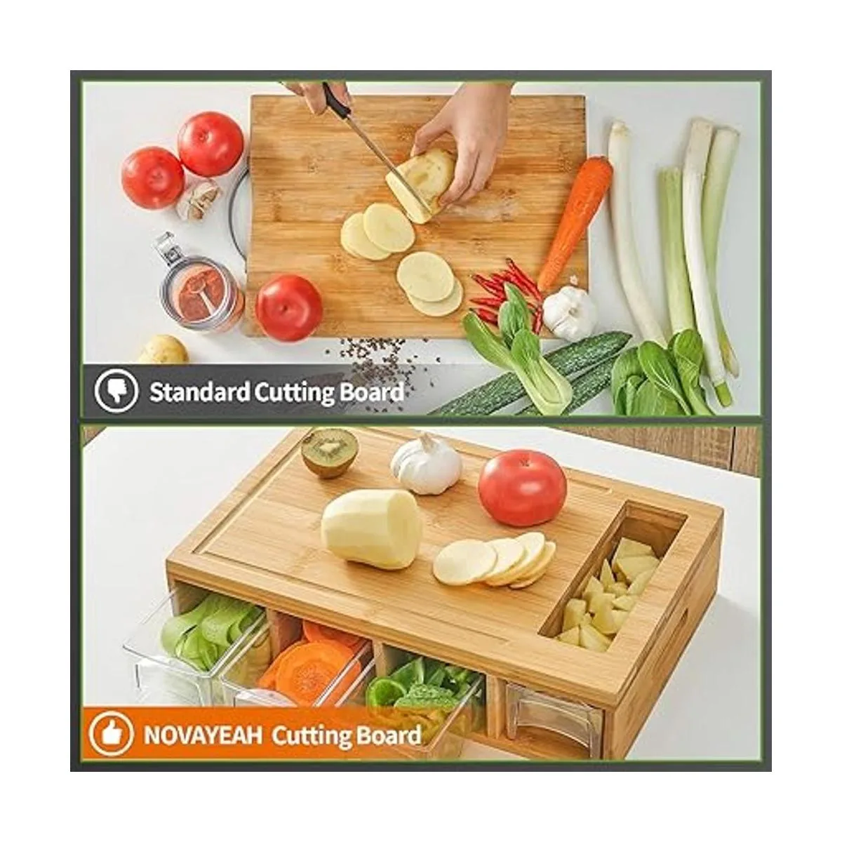 Novayeah tabla de cortar de bambú con 4 contenedores, tabla de cortar grande con ranuras para líquidos, asas de fácil agarre y apertura con contenedor deslizante para alimentos, tabla con bandejas para almacenamiento de alimentos, transporte y limpieza