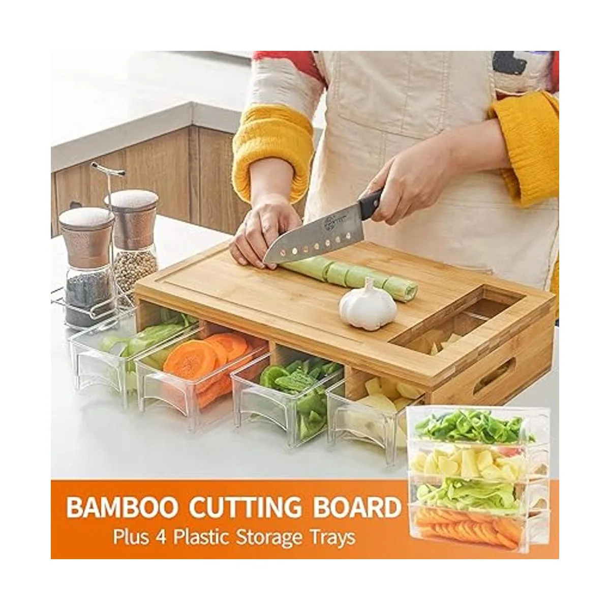 Organización y recolección fácil: esta tabla de cortar viene con 4 bandejas organizadoras de tereftalato de polietileno, son duraderas, ligeras, fáciles de mover y aptas para lavavajillas. La tabla de cortar también cuenta con ranuras integradas para capturar el exceso de líquidos y evitar los derrames en tu encimera o mesa.