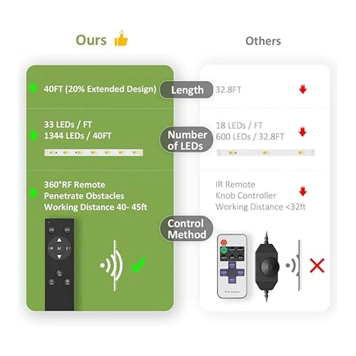 40ft Dimmable Tunable White Strip with 1344 LEDs 40ft superlong flexible white Led light strip with Daylight White 6000K, Neutral White 4500K, Warm White 3000K, 10 brightness levels. UL FCC listed for safety and quality assurance.