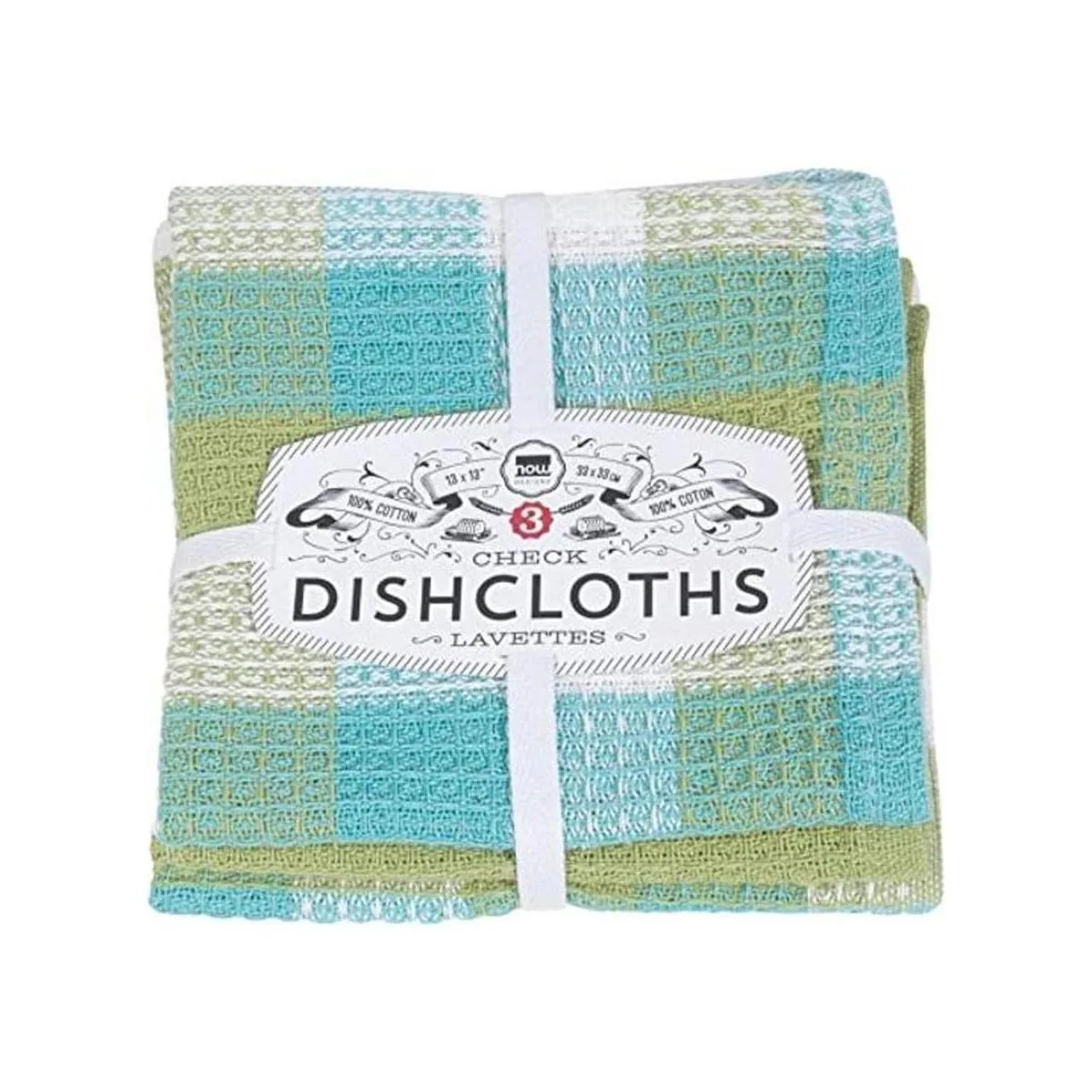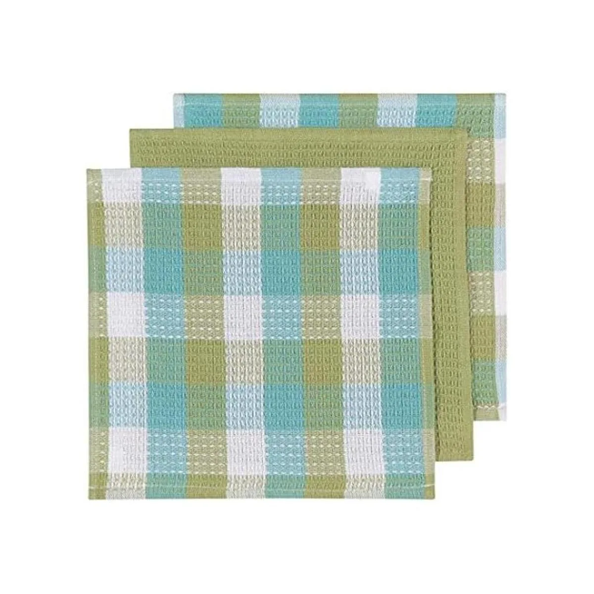 Dos paños de cocina con estampado a cuadros y un paño de cocina sólido a juego