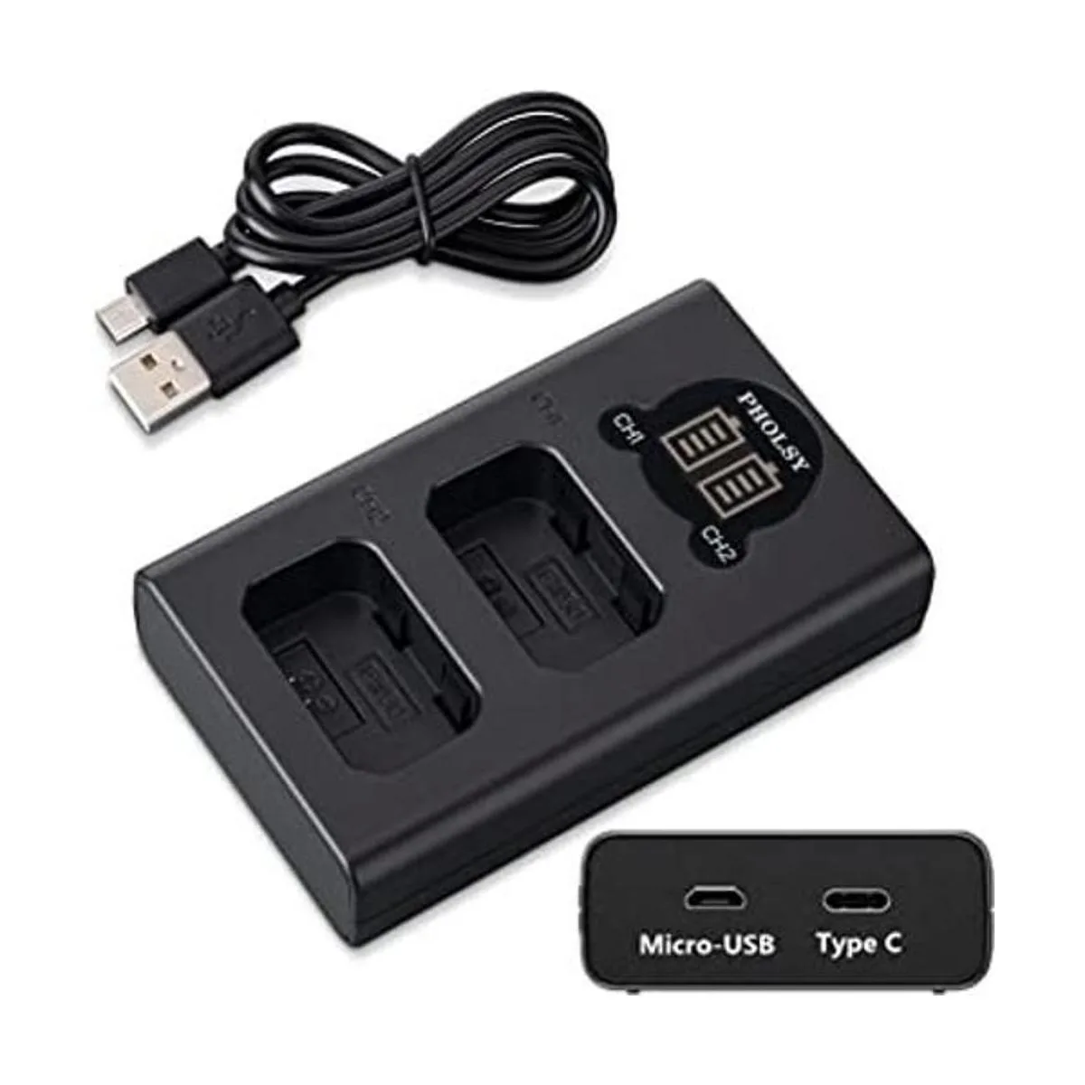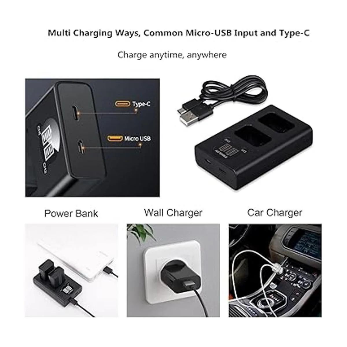 Uso en todo el mundo Cargador rápido El cargador NPFW50 / BCTRW mejora la eficiencia de carga. Y puede cargar dos baterías NPFW50 simultáneamente por dispositivos MicroUSB o USBC/tipo C como laptop, cargador de coche, cargador de pared, así como un banco de energía te ofrece más opciones que un cargador de batería estándar. Cada ranura de carga funciona de forma independiente. El cargador de batería de la cámara NPFW50 / BCTRW se puede cargar en cualquier país
