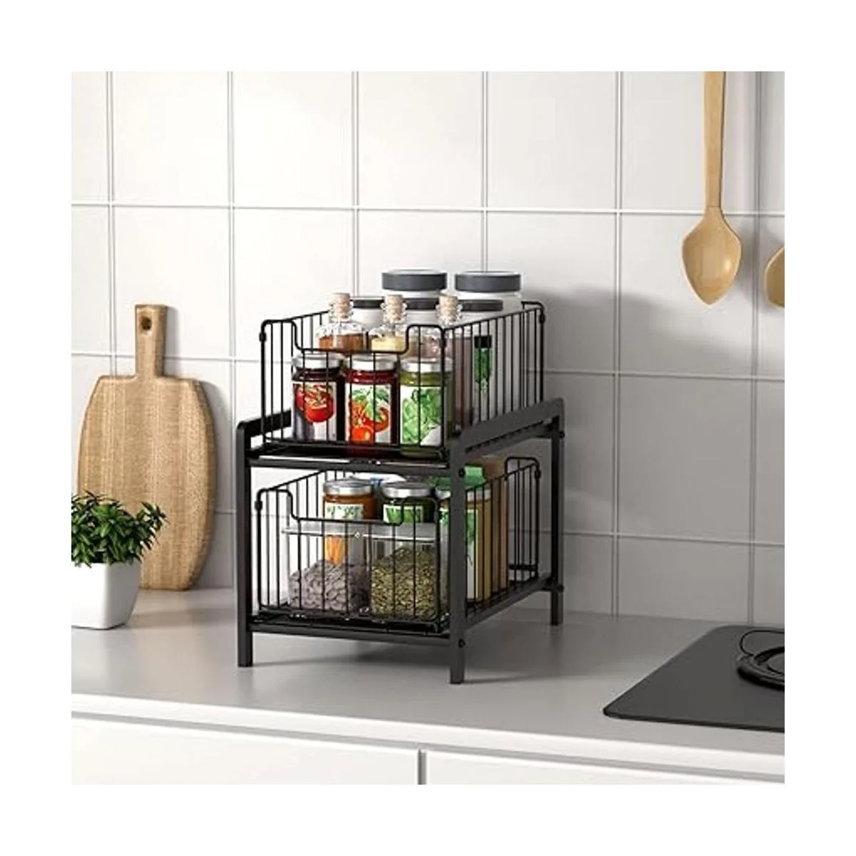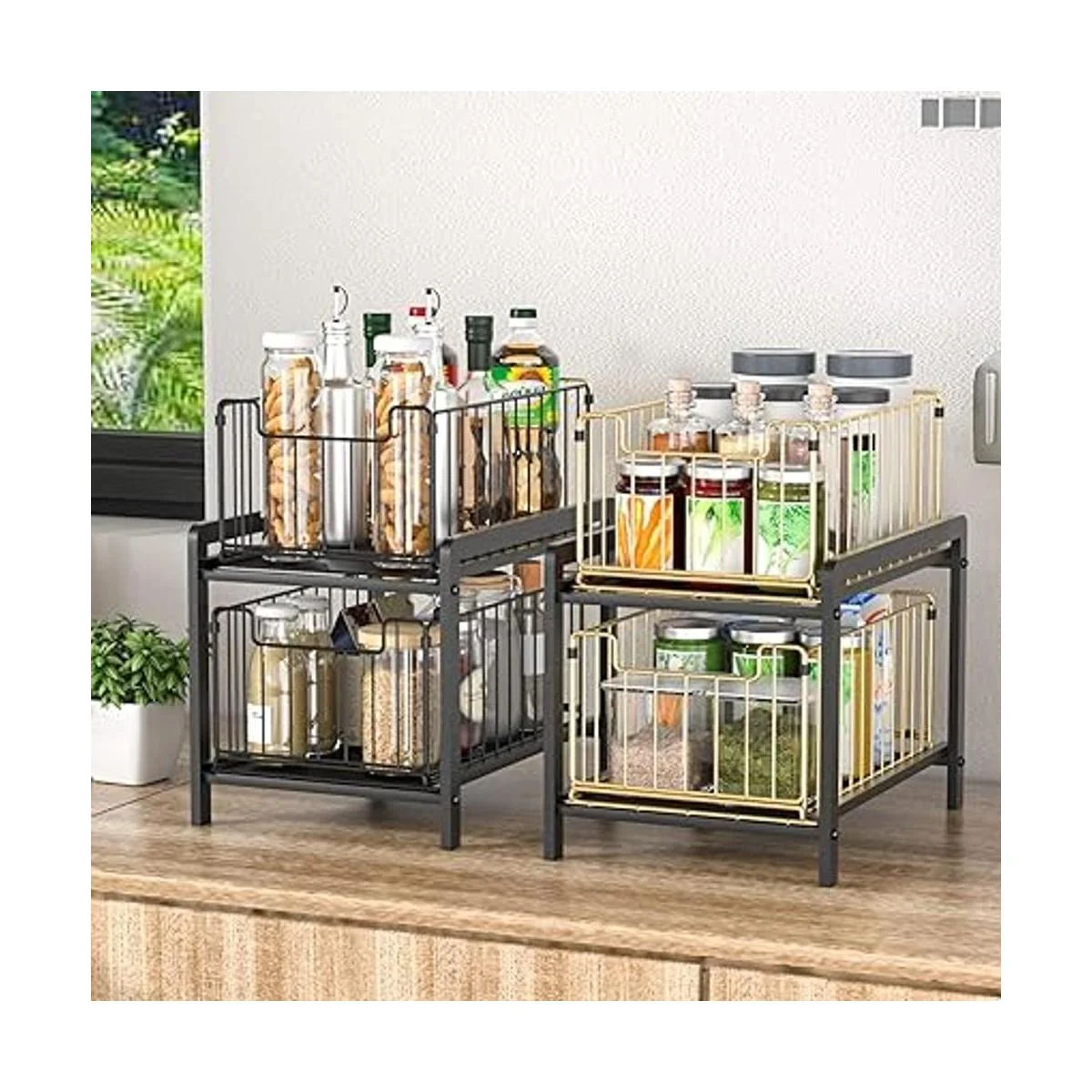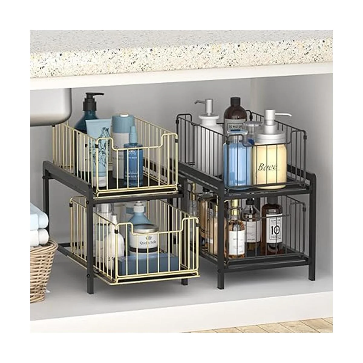 Cajones extraíbles de 2 niveles: puedes colocar tus necesidades en 2 capas, y la estructura visual de malla de hierro hace que sea fácil ver dónde quieres artículos de un vistazo. El uso razonable de tu espacio vertical puede mantener tu encimera o debajo del fregadero organizado.