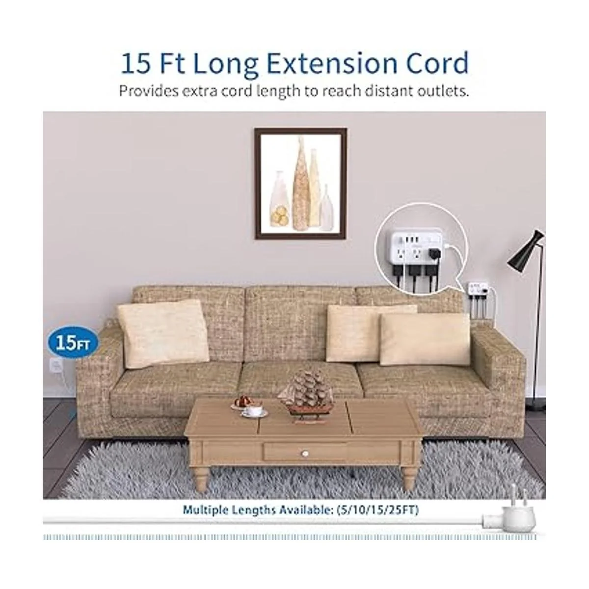 Cable de extensión extra largo con enchufe plano: el cable de extensión blanco de 15 pies te da la flexibilidad para llegar a tomas distantes y lugares difíciles de alcanzar. Una solución perfecta para cuando las tomas de corriente no están convenientemente ubicadas cerca. El enchufe en ángulo de 45 no bloquea el receptáculo inferior. El enchufe plano cuenta con un perfil bajo que cabe fácilmente en espacios reducidos como detrás de muebles, estanterías, escritorios.