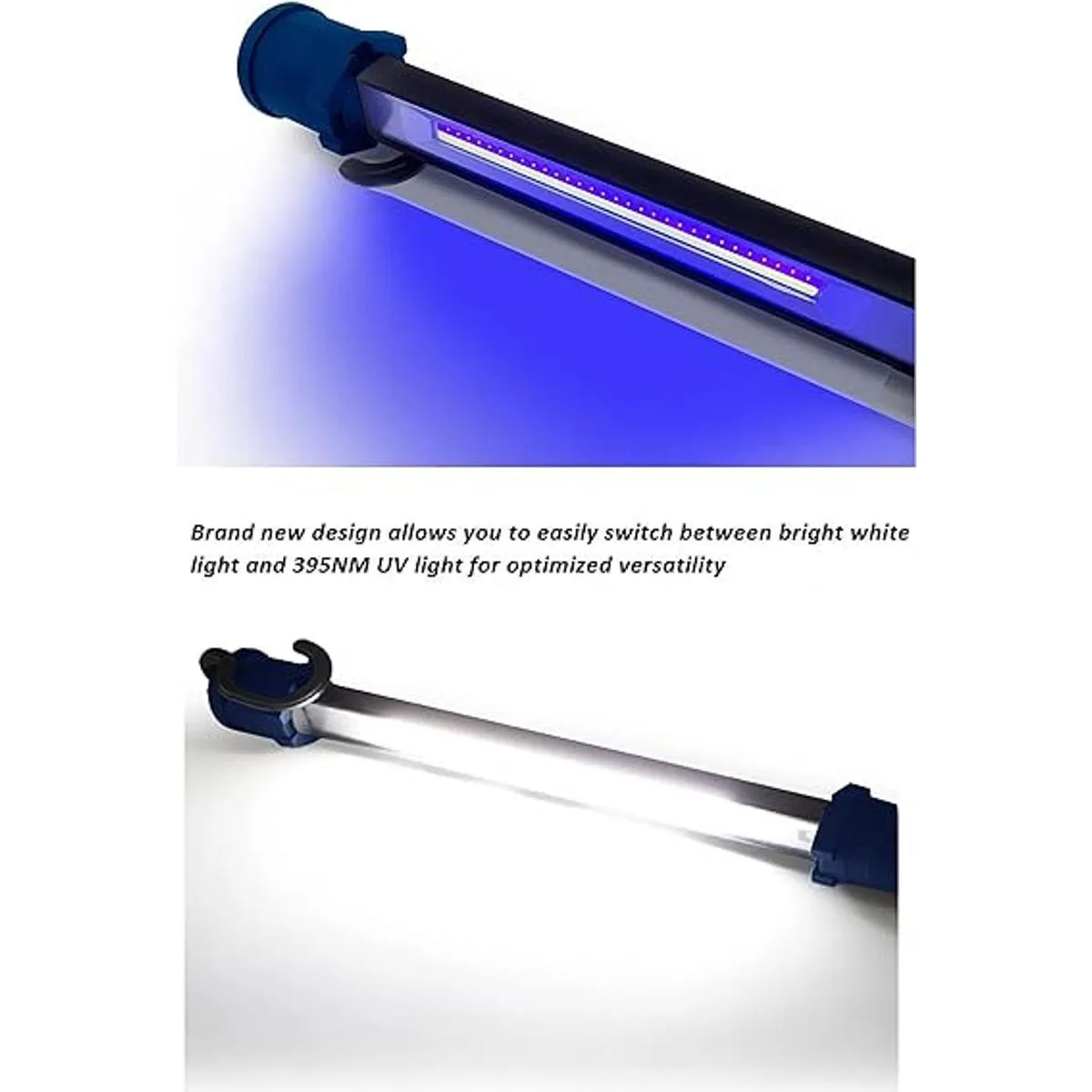Luz de trabajo sin cable 2 en 1: cuenta con luz UV de 1000 lúmenes/500 lúmenes/395 NM, luz LED con tecnología de chips integrados COB ayuda a aumentar la luz por pulgada cuadrada, proporcionando una iluminación brillante con una mayor eficiencia energética, al cambiar a luz UV, también puedes detectar fugas con facilidad.