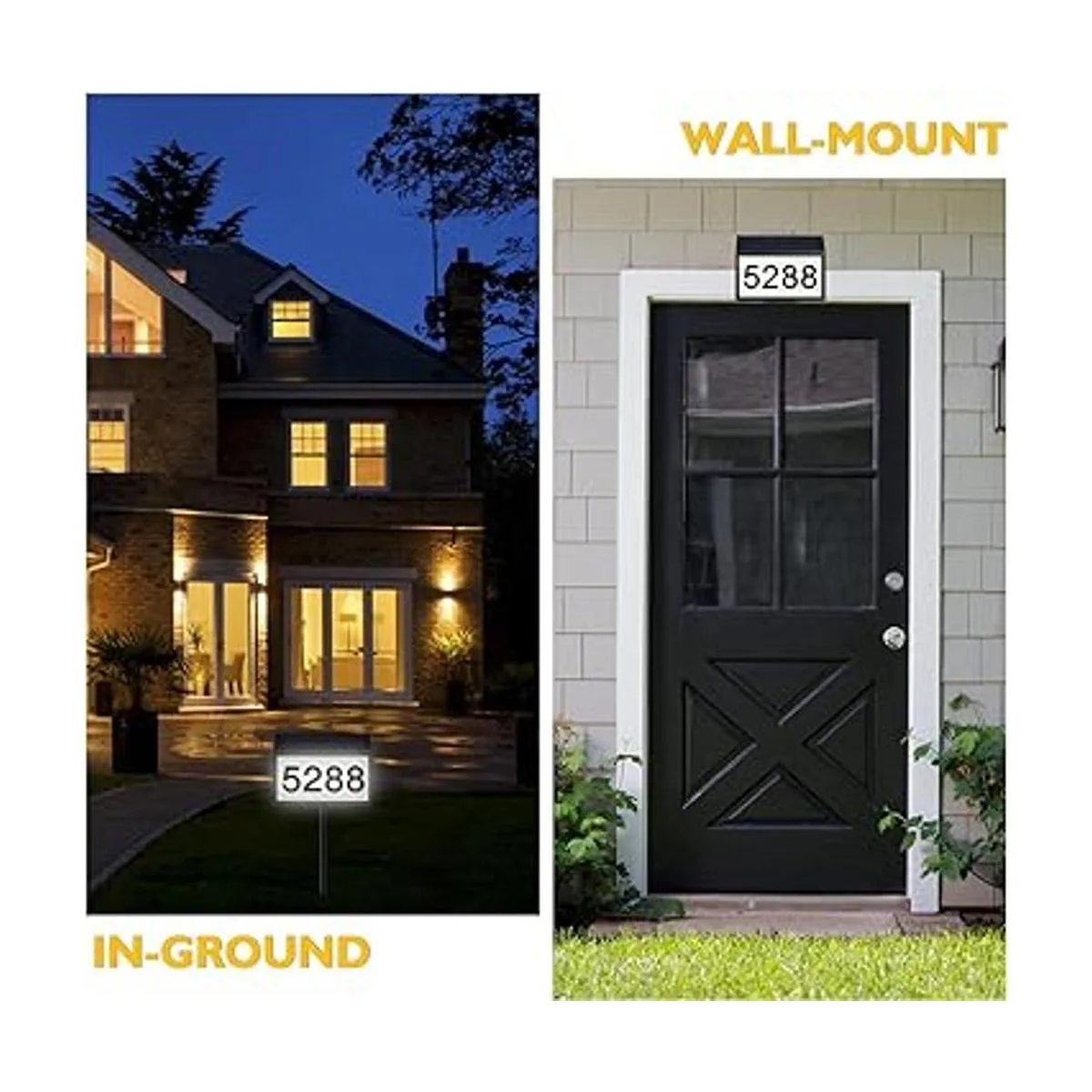 Números solares de casa para exteriores, letrero de dirección iluminado para patio con luz LED, estaca y calcomanías, placa de dirección impermeable para buzón de calle en casa, fácil de leer día y noche, color negro