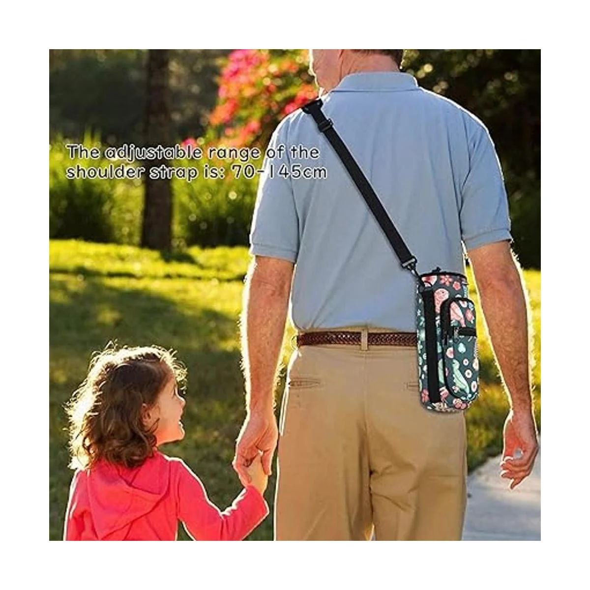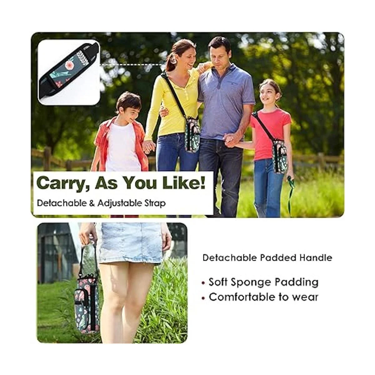 Dos maneras de transportar: Equipado con correa acolchada y correa de hombro ajustable, es cómodo de llevar. Esta bolsa de transporte para botellas de agua hace que tus manos estén libres para sostener la botella cuando estás al aire libre.