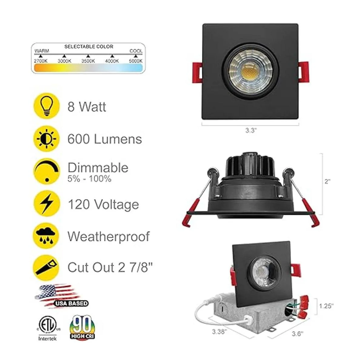 NUWATT Foco empotrable LED cuadrado de 3 pulgadas, paquete de 4, luz LED todo en 1 sin lata con 5 interruptores de color CCT de 2700K 5000K, 8W, 600 lúmenes, 120V, regulable, cuadrado negro