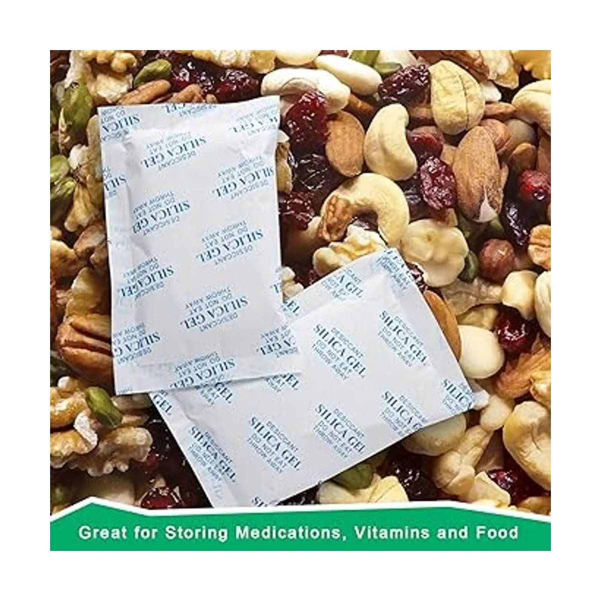 Grado alimenticio: cumple con las especificaciones para el embalaje de alimentos secos, los paquetes desecantes de gel de sílice contienen las cuentas desecantes absorbentes llamadas gel de sílice, los paquetes desecantes de gel de sílice no contienen cloruro de cobalto