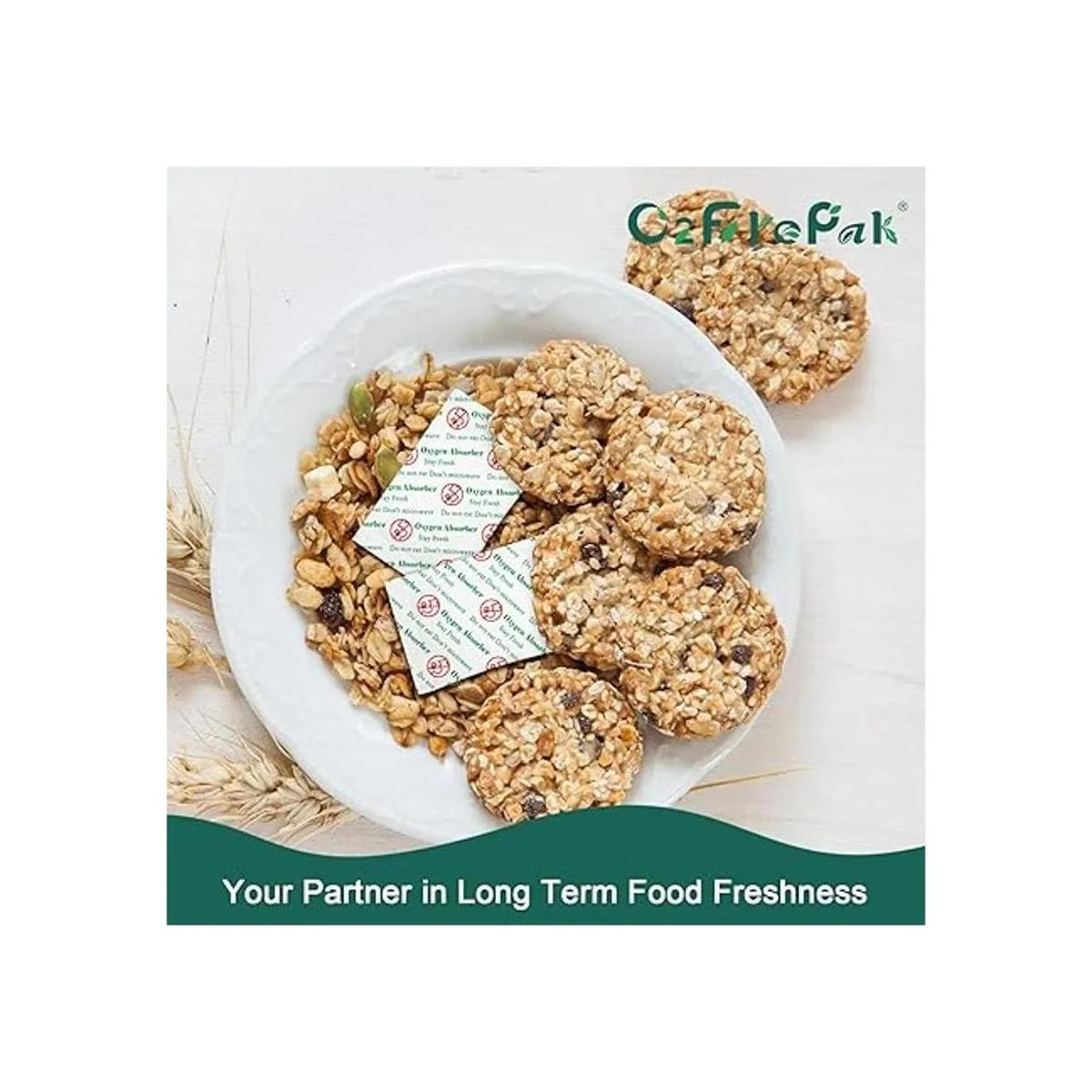O2frepak El absorbente de oxígeno es de la más alta calidad en la industria para el almacenamiento de alimentos a largo plazo, y tiene función antiaceite, por lo que se puede utilizar sin alimentos de aceite y con muchos alimentos de aceite.