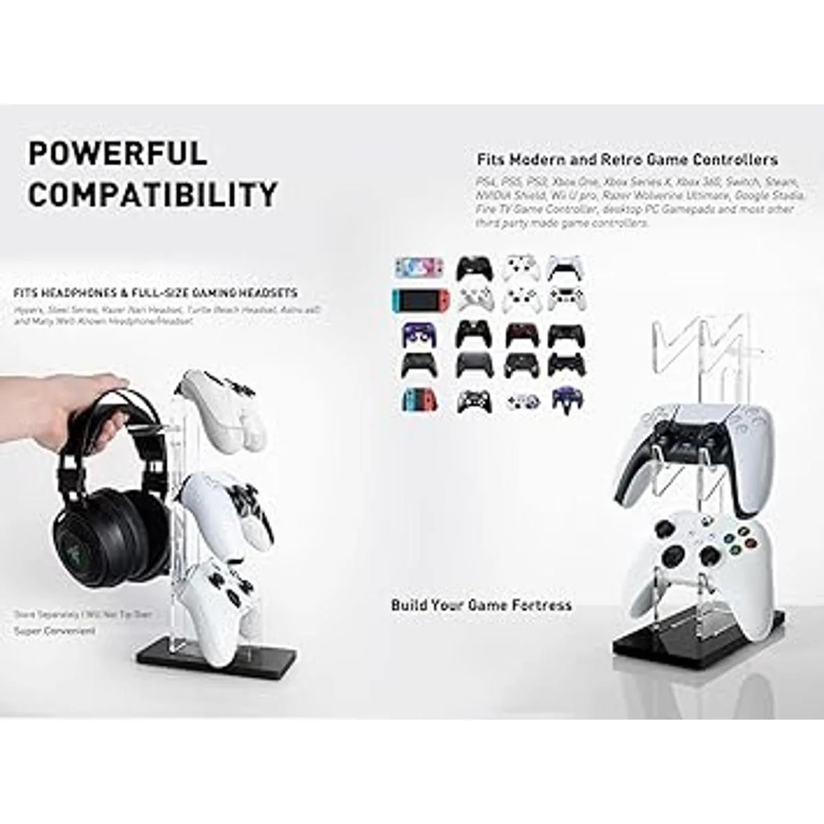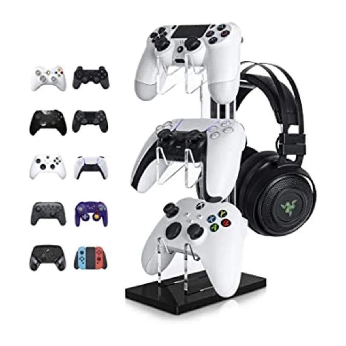 Construye tu fuerza de juego: los auriculares y el soporte de controlador OAPRIRE sostienen perfectamente hasta 3 controladores y un auricular de juego de tamaño completo, adecuado para casi cualquier versión del controlador, manteniendo tu espacio de juego libre de desorden y organizado.