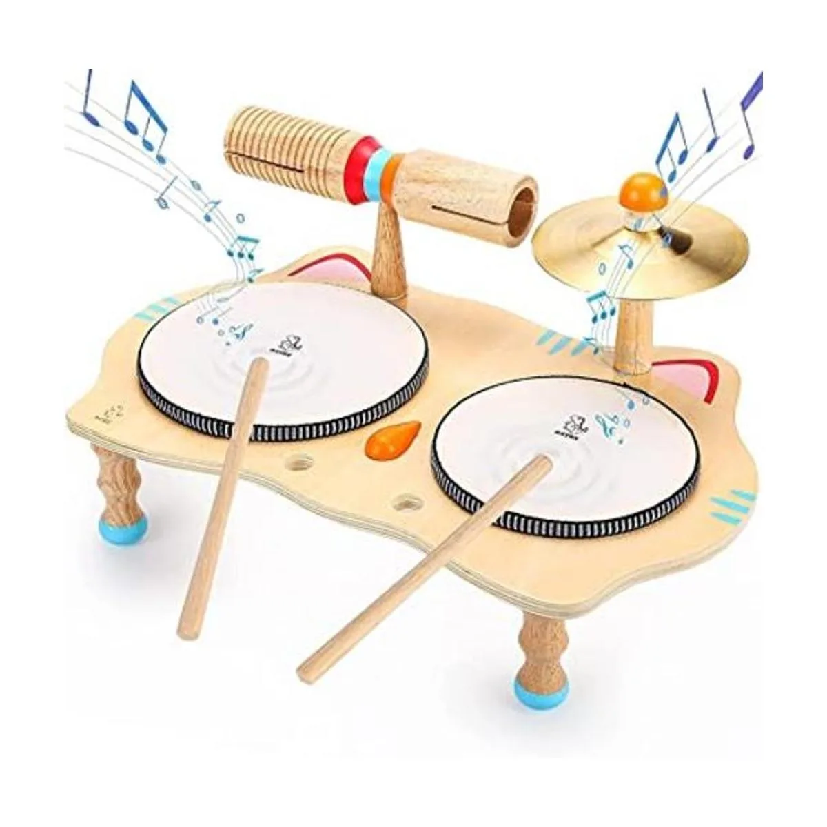 Juego de aprendizaje musical todo en uno: esta mesa musical de madera de 14.5 pulgadas tiene seis instrumentos de percusión, incluyendo un platillo, un bloque de tono de madera, un tambor de 6 pulgadas, un tambor de 5 pulgadas y dos baquetas de madera.