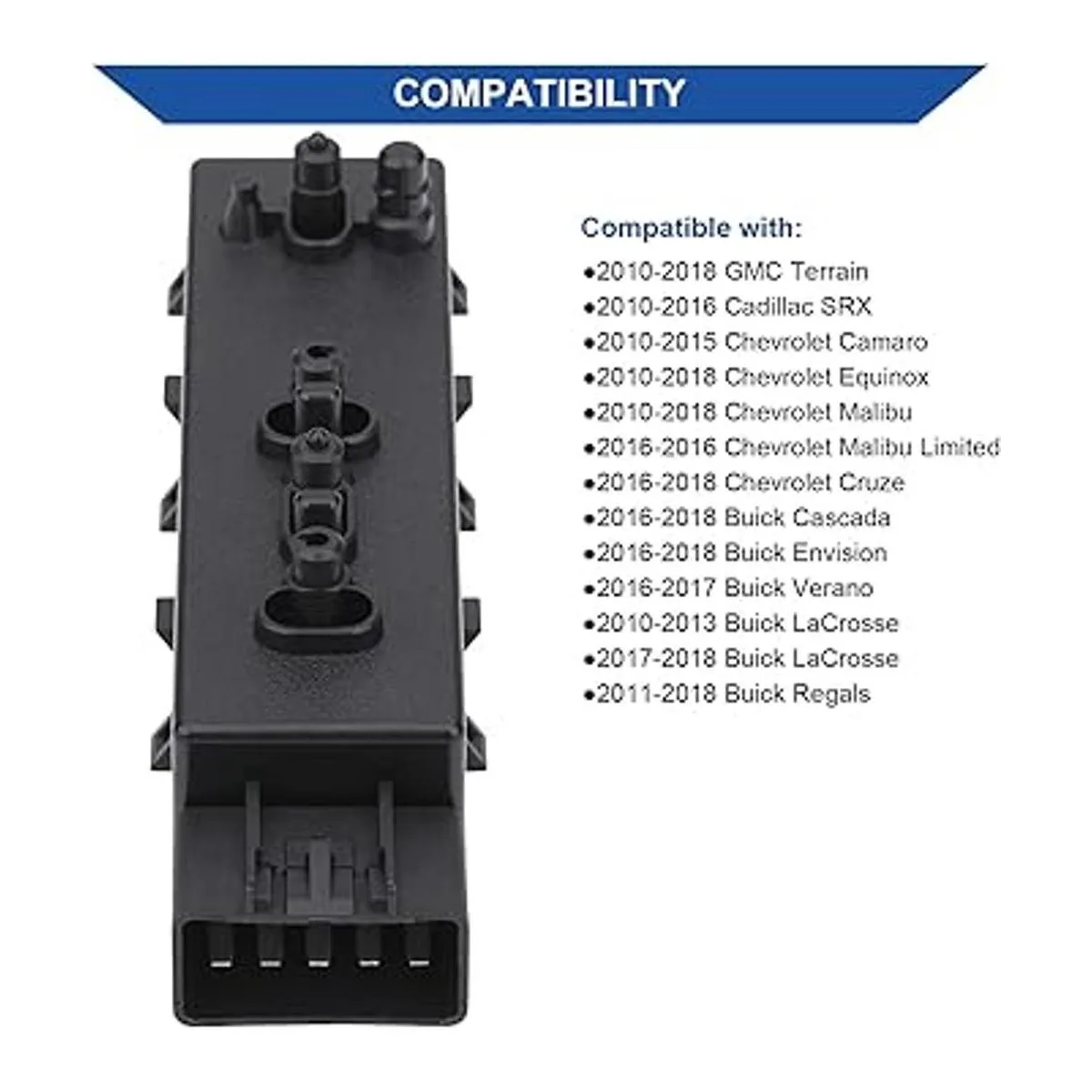 Compatibilidad: este interruptor reclinable automotriz es compatible con Cadillac SRX 20102016, GMC Terrain 20102018, GMC Acadia 20172018, Chevy Chevrolet 20102015 Camaro, 2010 2011 2012 2013 2014 2015 Equinox / Malibu 2016 2017 2018, Malibu Limited 2016, Cruze 20162018, Traverse 20182019, Buick 20102013 20172018, LaCrosse, 20162017 Verano, 20162018 Cascada / Envision, 20182019 Enclave, 11 12 13 14 15 16 17 Regal, 20182019 Regal Sportback, 20182019 Regal TourX.