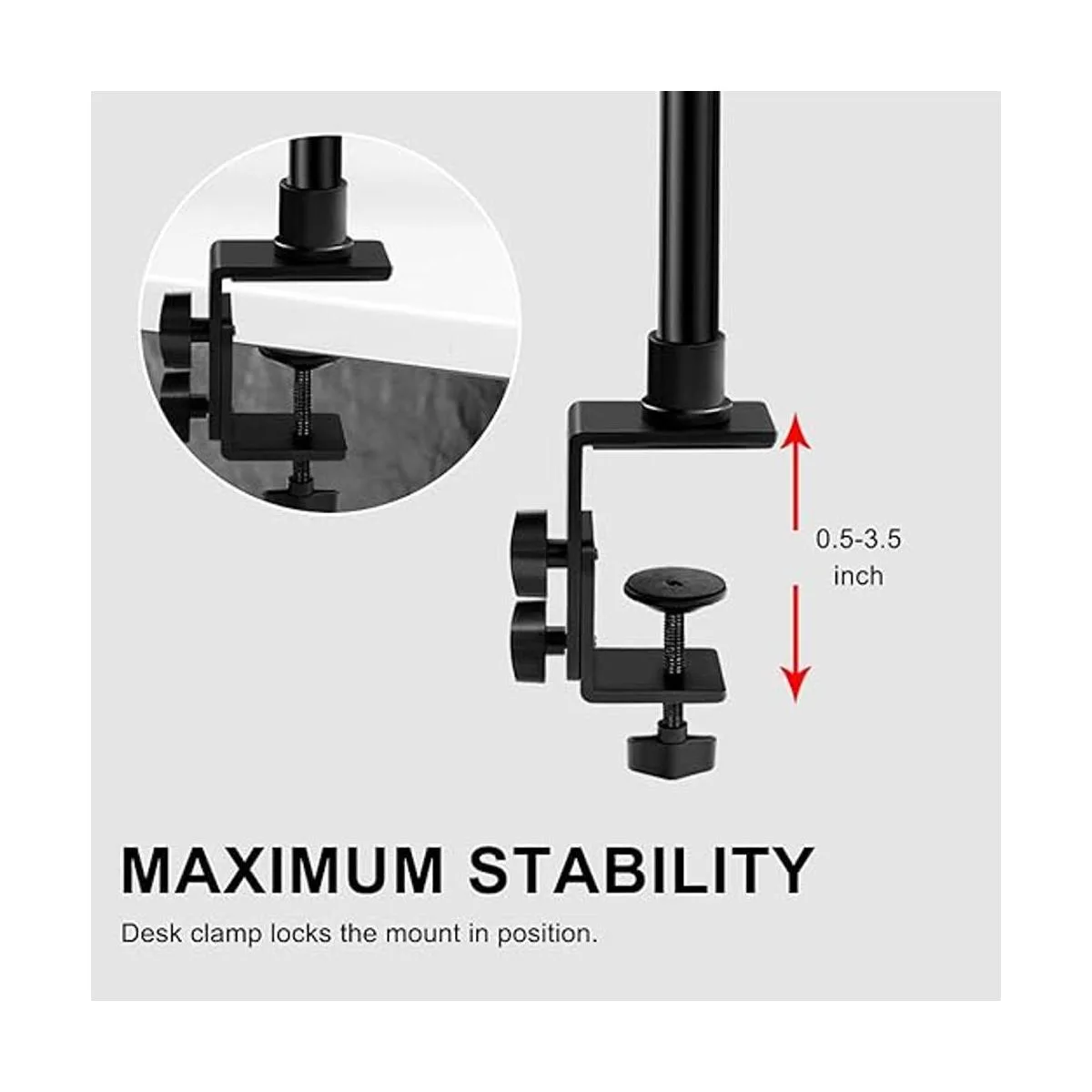 Posición flexible: con un cabezal giratorio de 360 grados en el extremo del brazo mágico te hace un uso cómodo cuando necesitas cualquier ángulo del dispositivo. Con sus abrazaderas de metal sólido, soporte ajustable y resistente. Se monta en la parte posterior de tu escritorio rango de 0.5 a 3.5 pulgadas de grosor a través de una abrazadera en C resistente o soporte de ojal opcional. Nuestro soporte de escritorio se puede ajustar a cualquier grosor en cuestión de segundos según sea necesario.