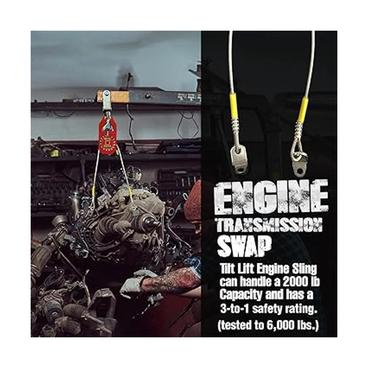 Fácil de usar: nuestra correa de elevación puede manejar 2000 libras. capacidad y tiene una calificación de seguridad 3 a 1 probado a 6.000 libras. Los tacos de montaje se sujetan a cualquier motor, lo que permite un intercambio rápido y fácil del motor y de la transmisión