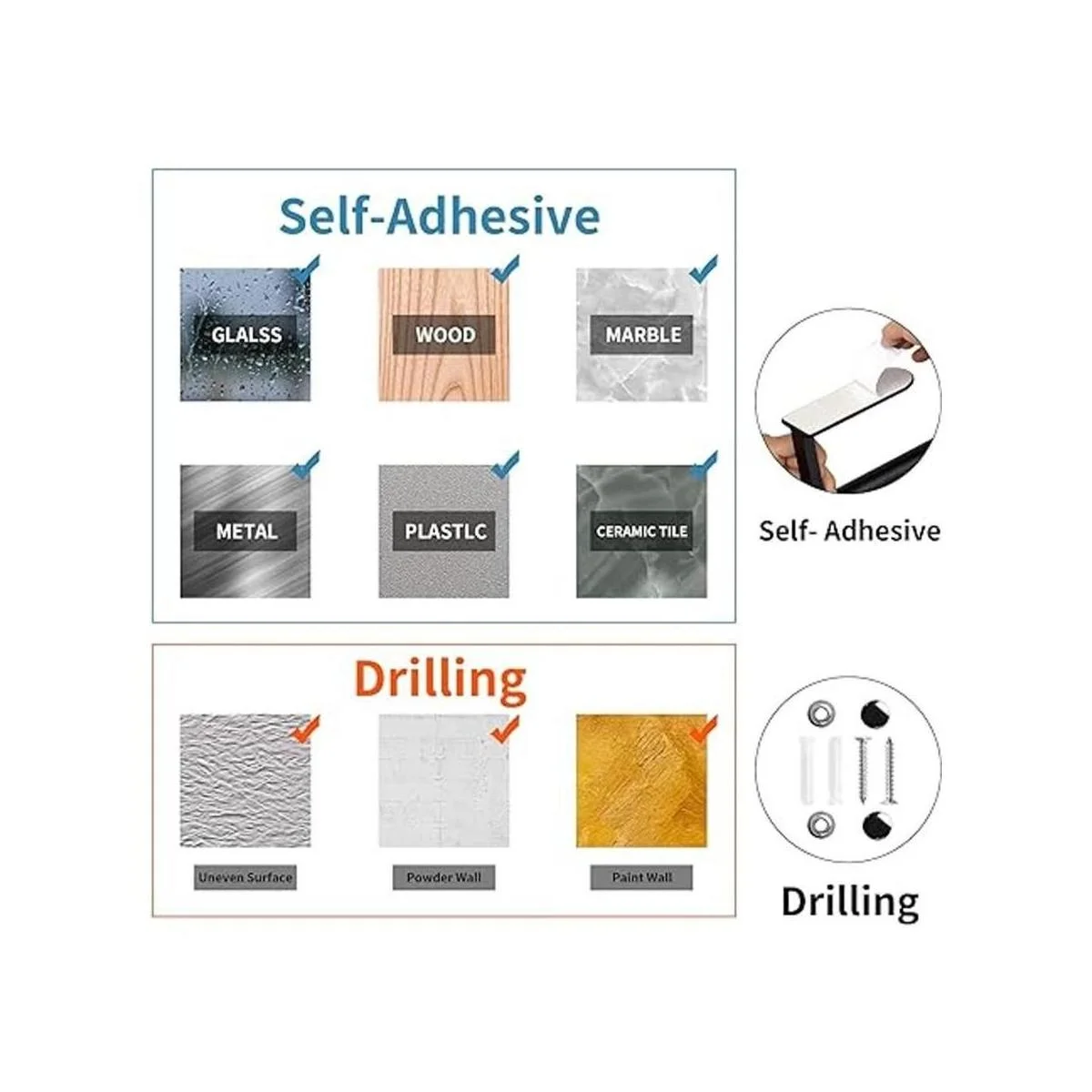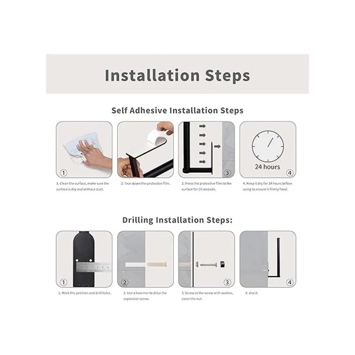 Dos métodos de instalación: Autoadhesivo para una superficie lisa: Simplemente limpia y seca la superficie objetivo, retira la película protectora, luego presiona duro el soporte para toallas de papel en una superficie lisa durante 10 segundos, espera 24 horas antes de usar. Perforación: utilizando el método de instalación de perforación en la superficie con juegos de tornillos.