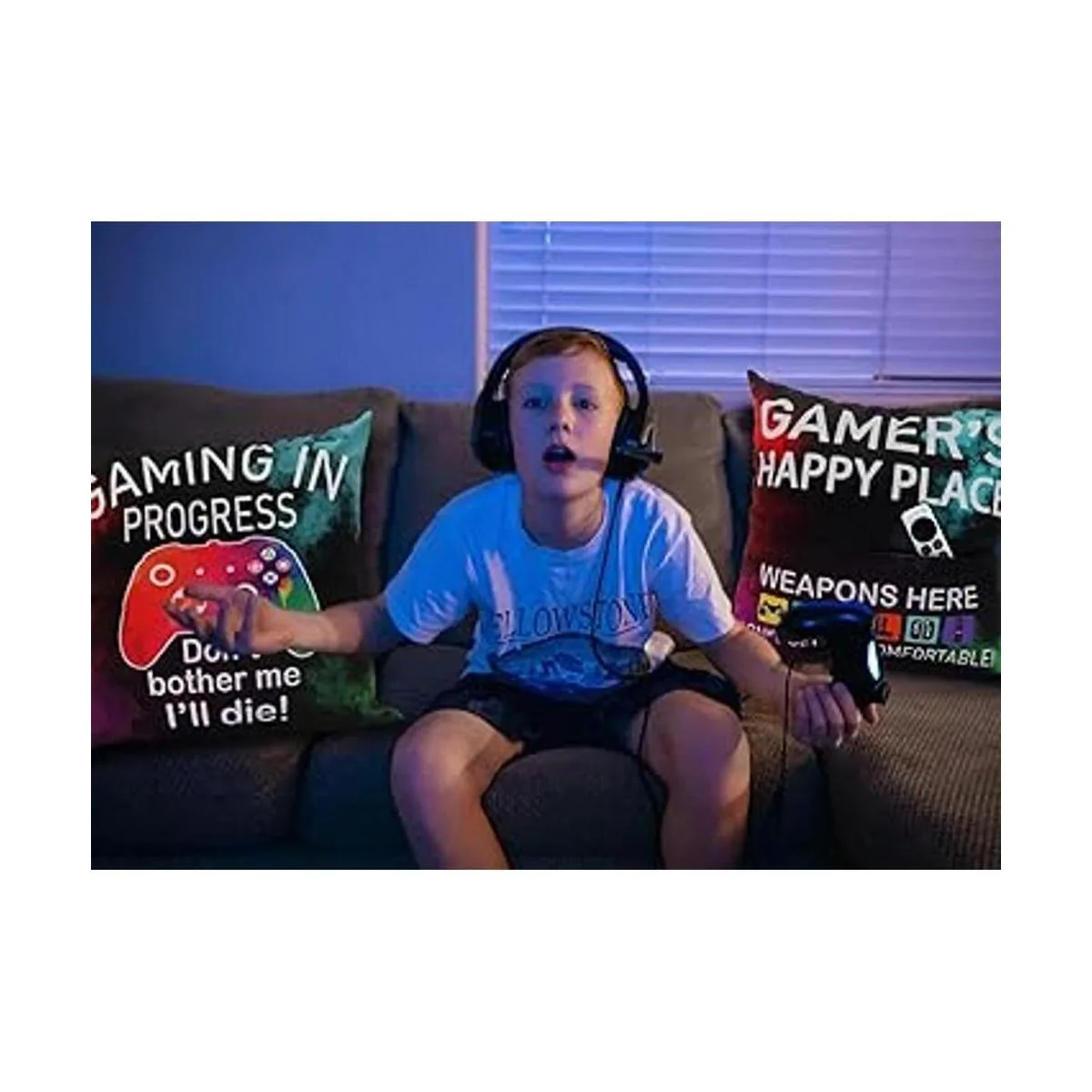 La funda de almohada de impresión de doble cara: GAMERS HAPPY PLACE impreso en la parte delantera. Es una buena manera para que los jugadores de juego realmente mantengan su posición en el sofá. La parte posterior está impresa con Dont bother me Ill die Con una imagen del logotipo del juego, este patrón puede encender la atmósfera y hacer que todos se rían felizmente