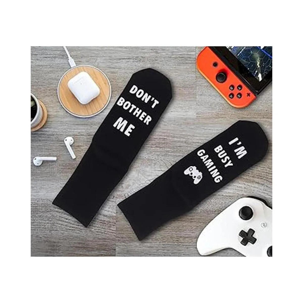 Bonitos calcetines de juego: los novedosos calcetines de juego adoptan la goma antideslizante, y cada calcetín está impreso con palabras interesantes: DONT BOTHER ME, IM BUSY GAMING En línea con el estado de ánimo y el estilo de los jugadores de juego, estos calcetines hacen que la gente sepa que estás ocupado jugando. Ten cuidado al manejar calcetines si eres alérgico al látex. Los calcetines de juego se pueden lavar a máquina y lavar a mano.