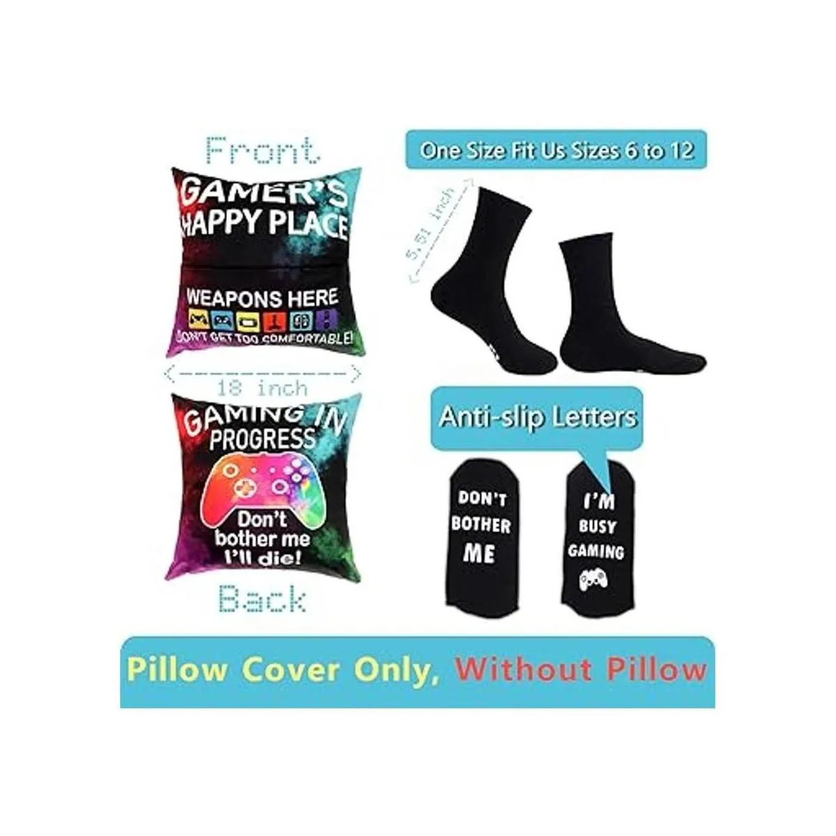 OCCdesign Regalos de jugadores para adolescentes, decoración de sala de juegos, funda de almohada y calcetines de juego