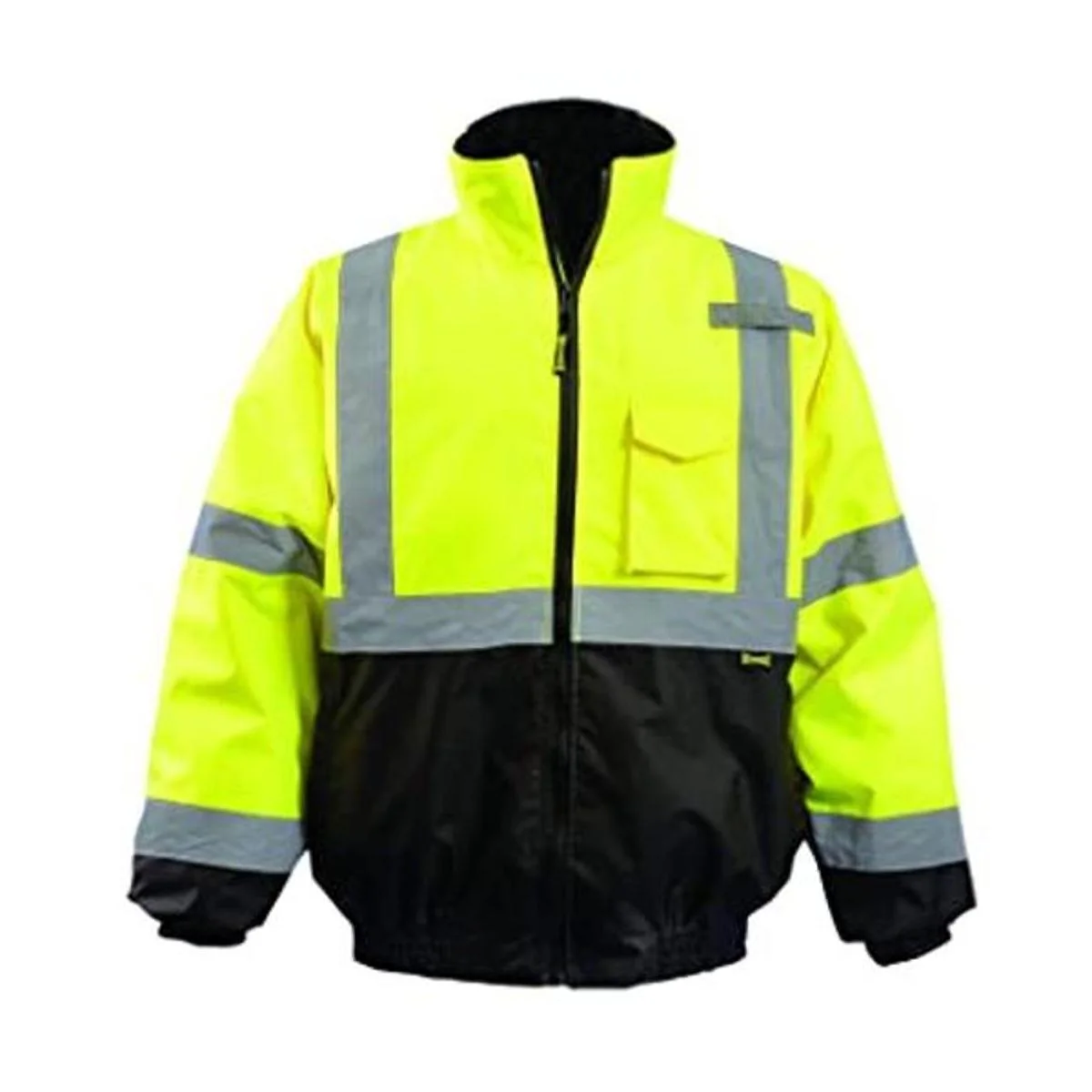 Chaqueta bomber de dos vías con parte inferior negra clase 3 2 en 1 con cinta reflectante plateada de 2 pulgadas, cierre de cremallera frontal con solapa interior de tormenta y capucha enrollable