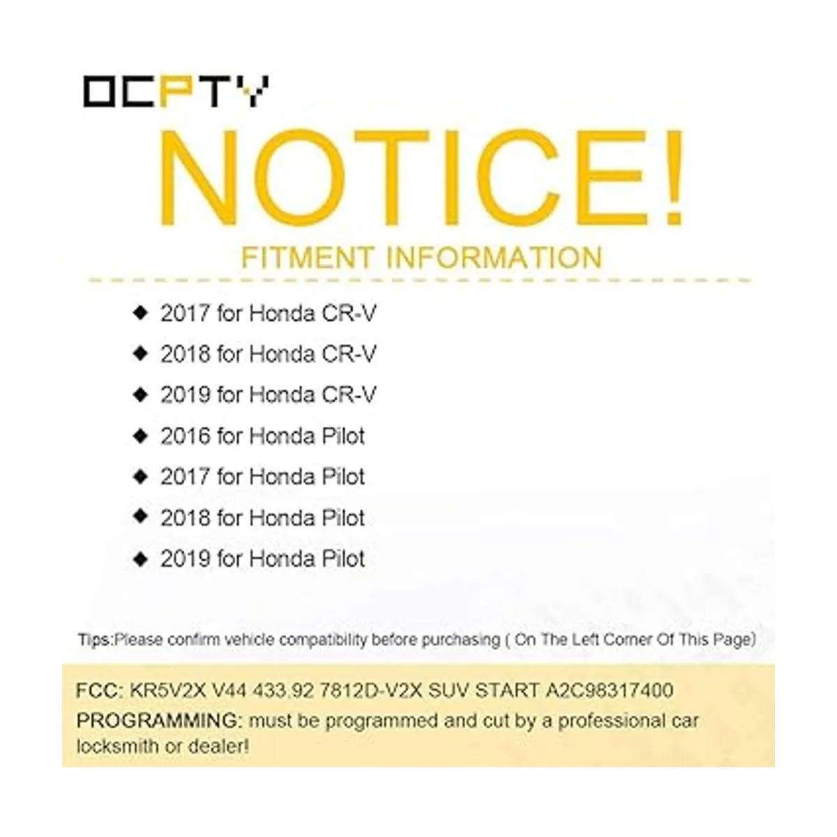 OCPTY 2 llaveros de control remoto sin llave sin cortar para Honda 20162020 para Honda para Civic para Honda para CRV para Honda para Pilot KR5V2X V44 433.92 7812DV2X A2C98317400 5 botones