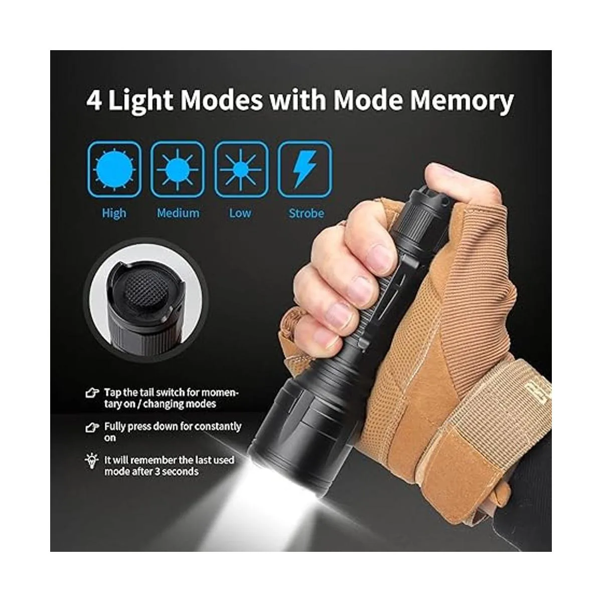 4 modos de luz estroboscópico altomediobajo con memoria de modo: todos los ajustes están controlados por un interruptor trasero de tecla. El NT23 también cuenta con una función de memoria de modo inteligente, lo que significa que la luz recordará la última configuración que estaba encendida cuando la apages. Cuando el NT23 se vuelve a encender, vuelve inmediatamente al último ajuste de luz utilizado por lo que no hay necesidad de pasar por los ajustes disponibles para volver al último uso.