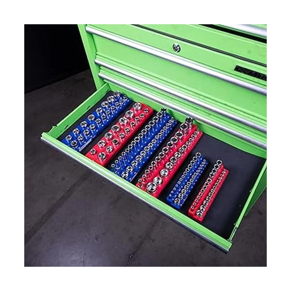 Organización del pecho de herramientas para el hogar: encontrar el enchufe adecuado es un dolor; por suerte, todos tus enchufes se pueden encontrar fácilmente dentro de tu cajón de caja de herramientas con este organizador de enchufes magnético; este juego tiene capacidad para hasta 68 enchufes en tamaños de unidad de 1/4, 3/8 y 1/2