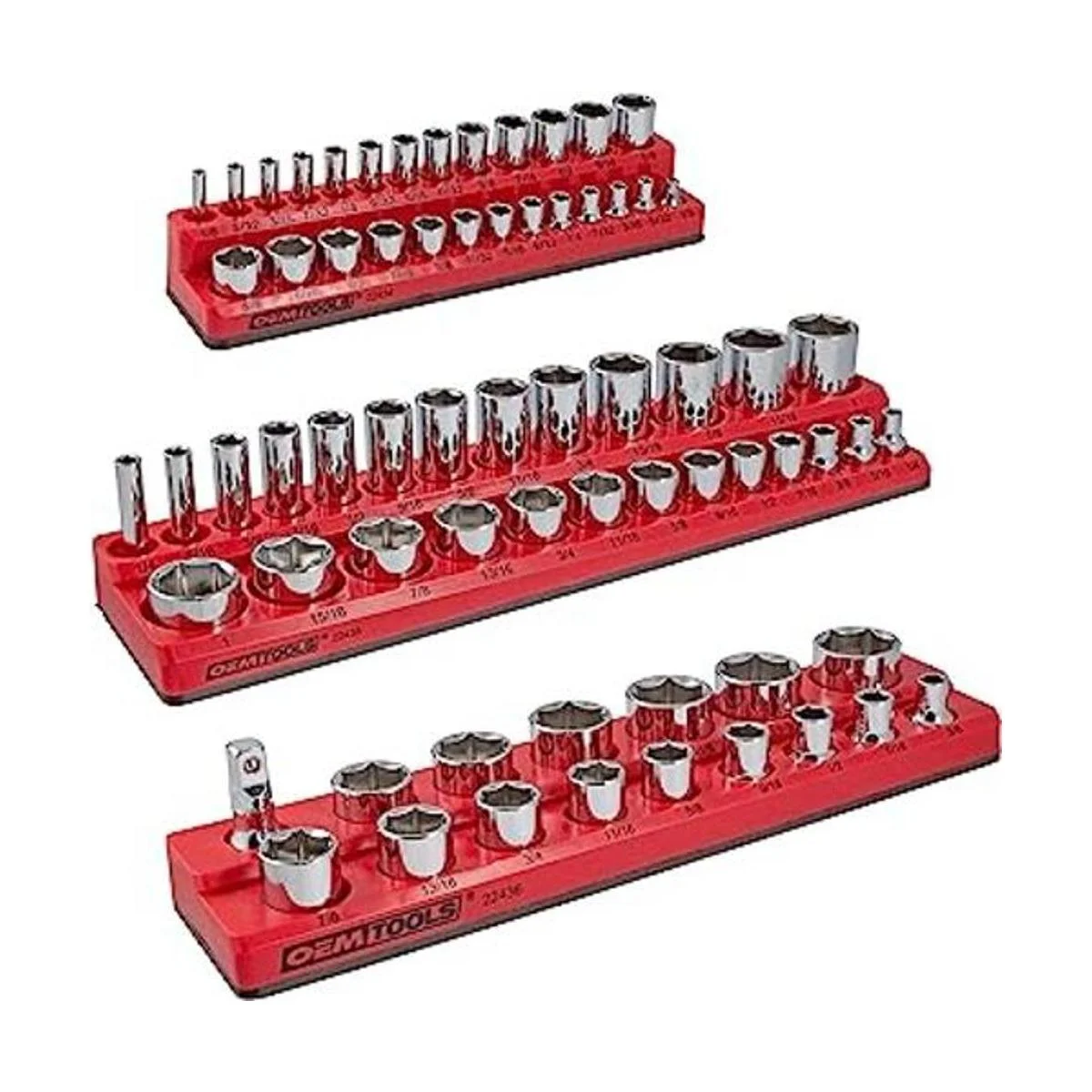 OEMTOOLS 22484 Juego de bandejas magnéticas SAE de 3 piezas, organizadores magnéticos para cajas de herramientas, base de goma, capacidad para hasta 68 enchufes, soporte rojo