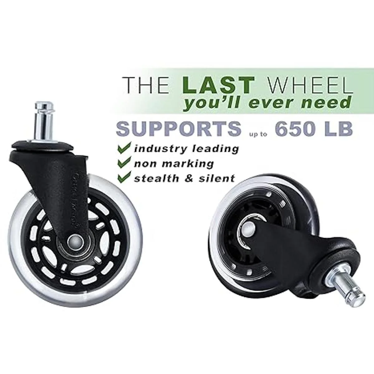 Ruedas de repuesto Transforma tu silla de oficina en una máquina de deslizamiento suave con este juego de 5 ruedas resistentes. Simplemente retira las ruedas viejas que dañan el suelo e instala estas ruedas de repuesto de fácil deslizamiento. Nuestras ruedas ruedan tan suavemente que incluso podrás deslizarte sobre la alfombra sin esfuerzo.