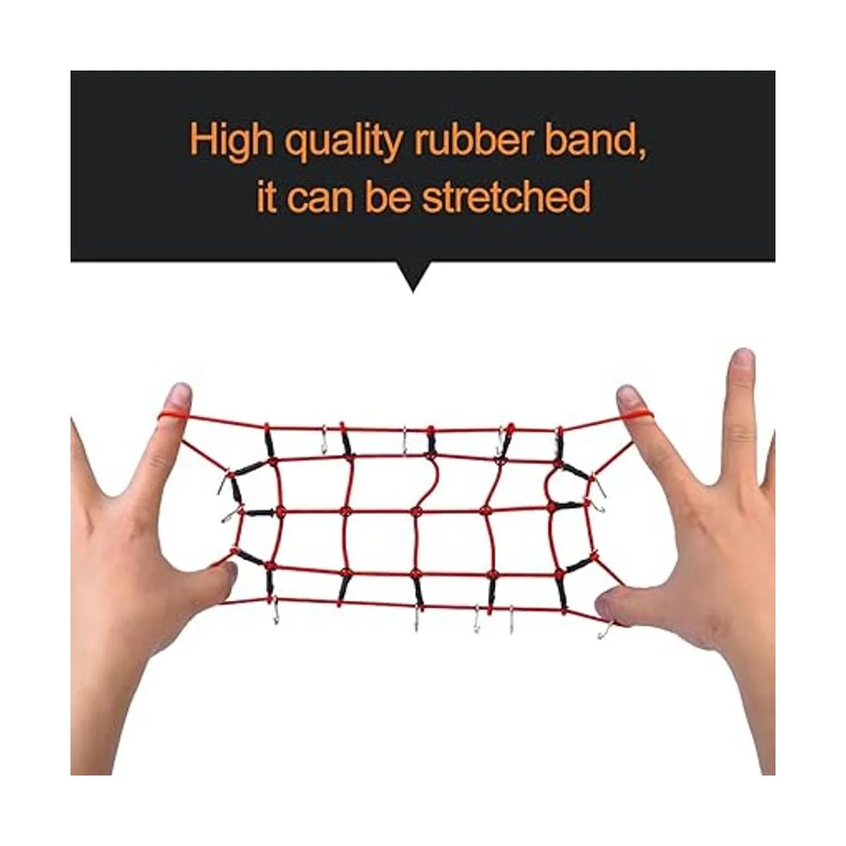 Las tres cajas rojas están hechas de material plástico, la red de equipaje es una red elástica para equipaje, la caja de madera está hecha de madera pura, la pala está hecha de metal, el adorno de simulación, aumenta la autenticidad de tu coche RC.