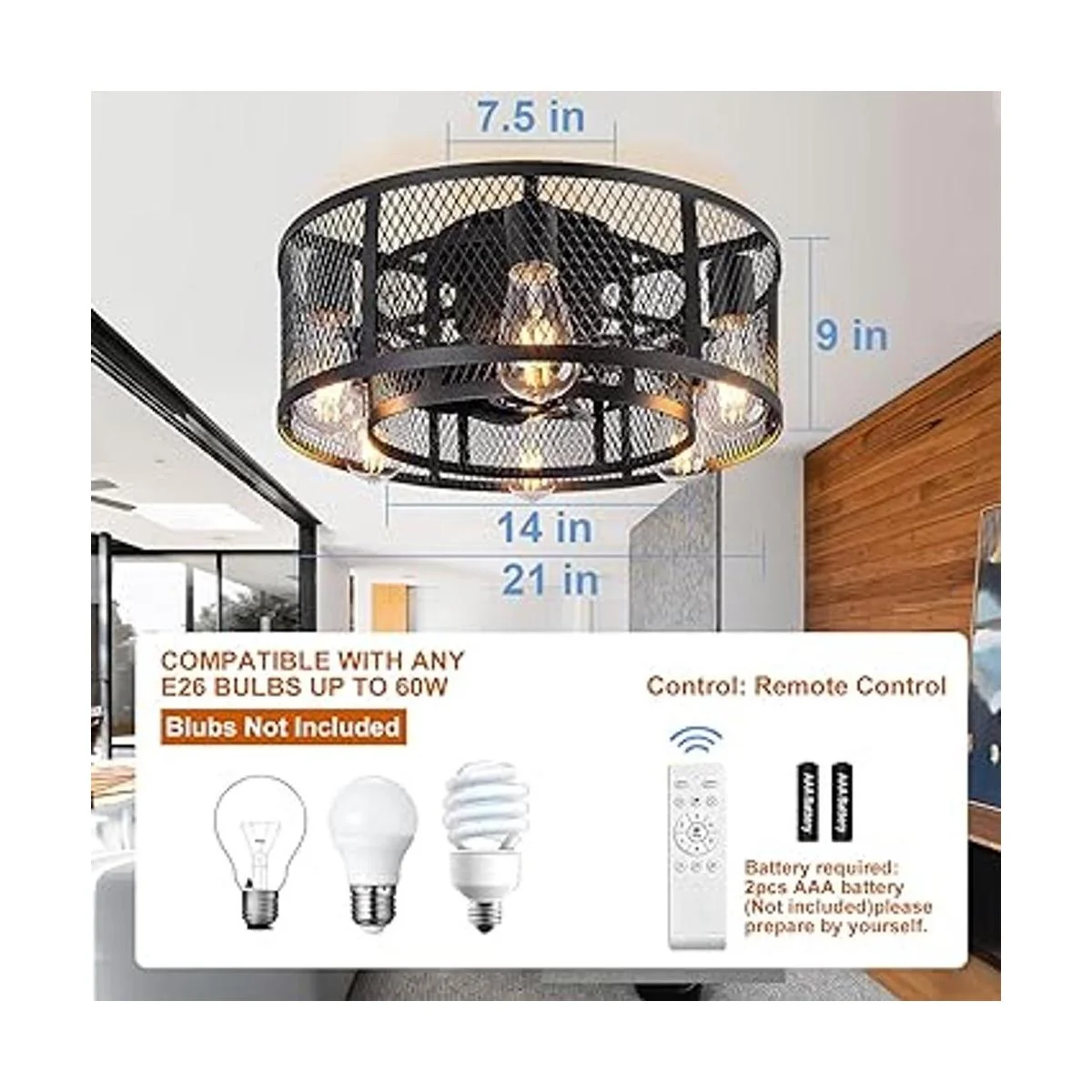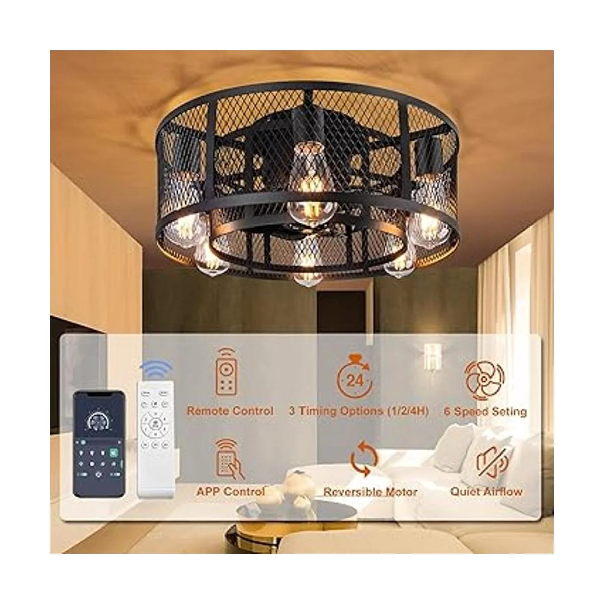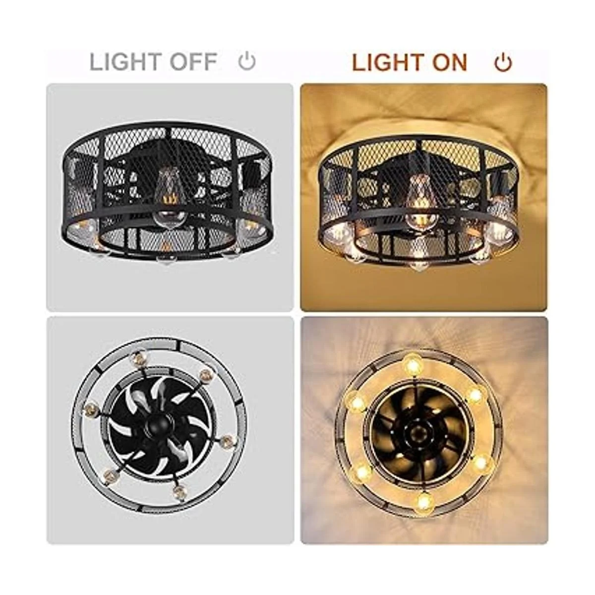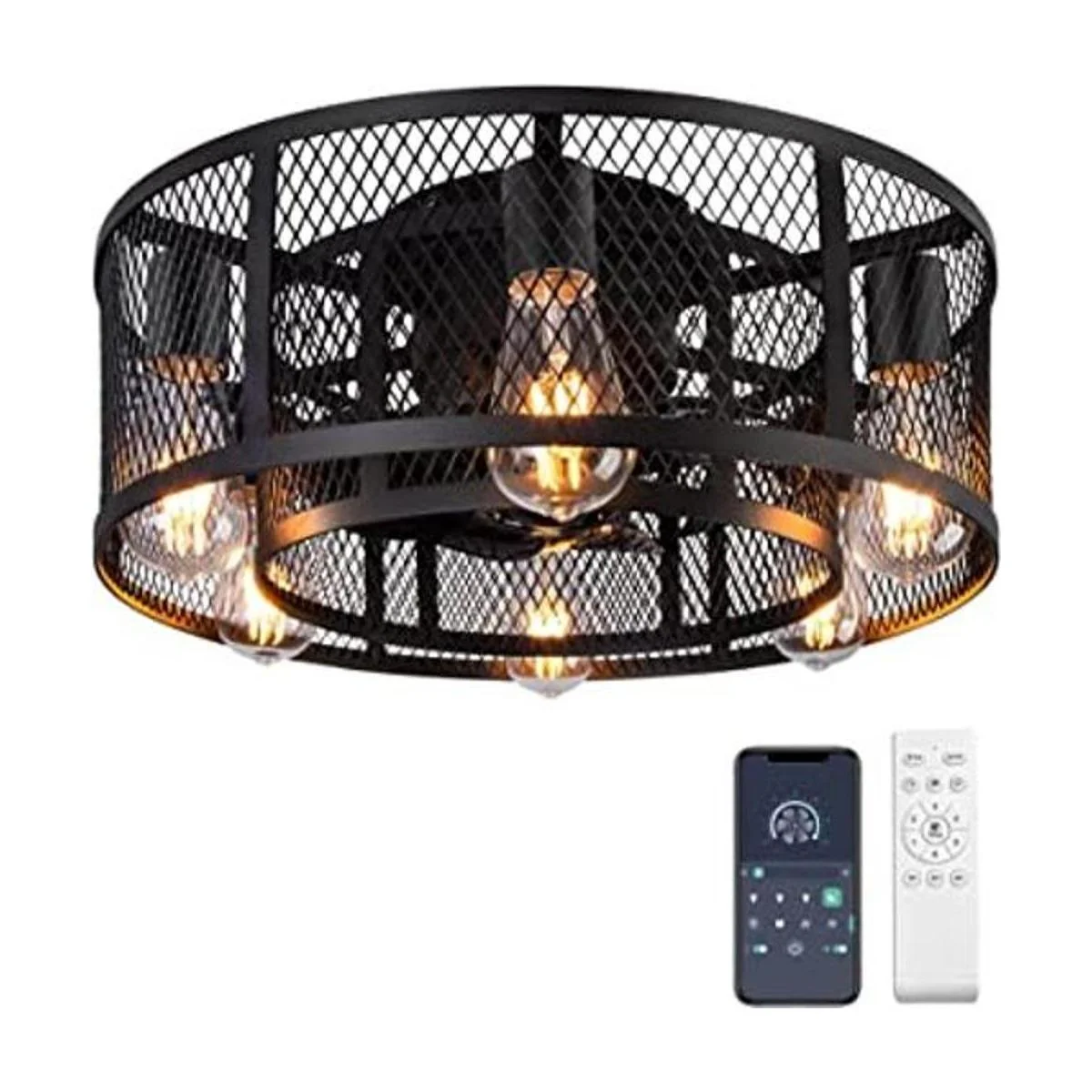 Ohniyou Ventilador de techo de jaula con luz, ventilador de techo de perfil bajo de 21 pulgadas con control remoto de luz, ventilador de techo industrial sin aspas con luces para dormitorio, sala de estar, cocina