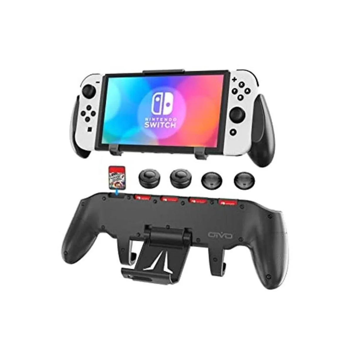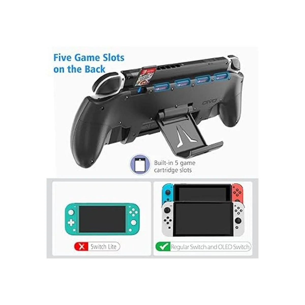 OIVO Agarre de interruptor con soporte ajustable mejorado compatible con Nintendo Switch y OLED, agarre asimétrico con soporte ajustable mejoradosoportes de cartucho y 5 ranuras de juego, 4 tapas de golpe incluidas