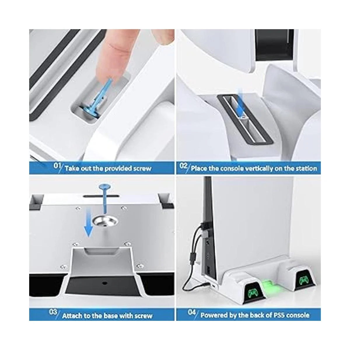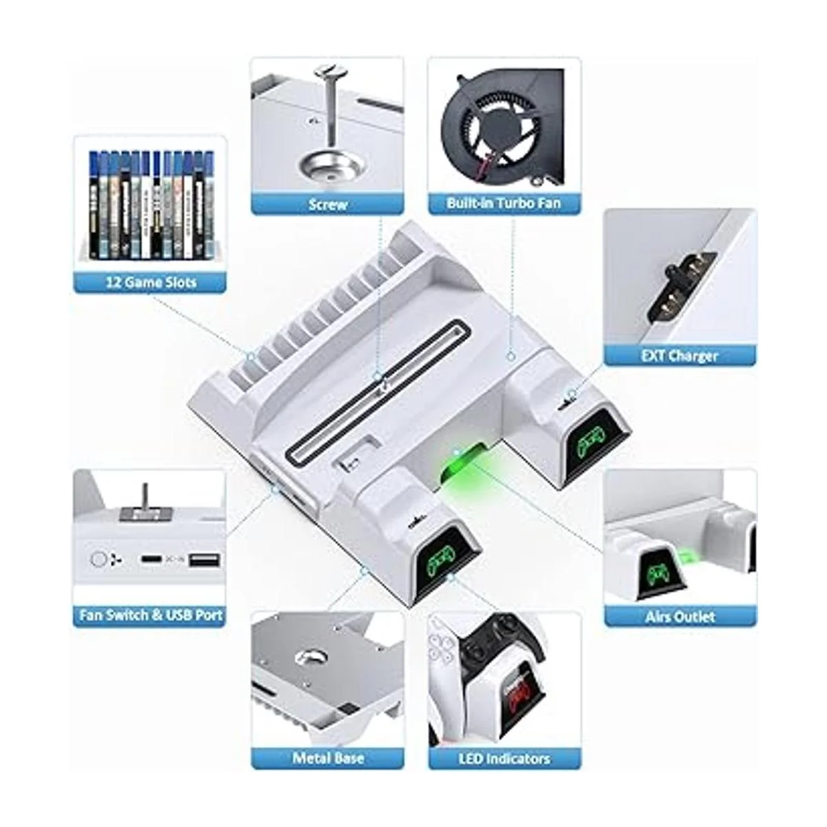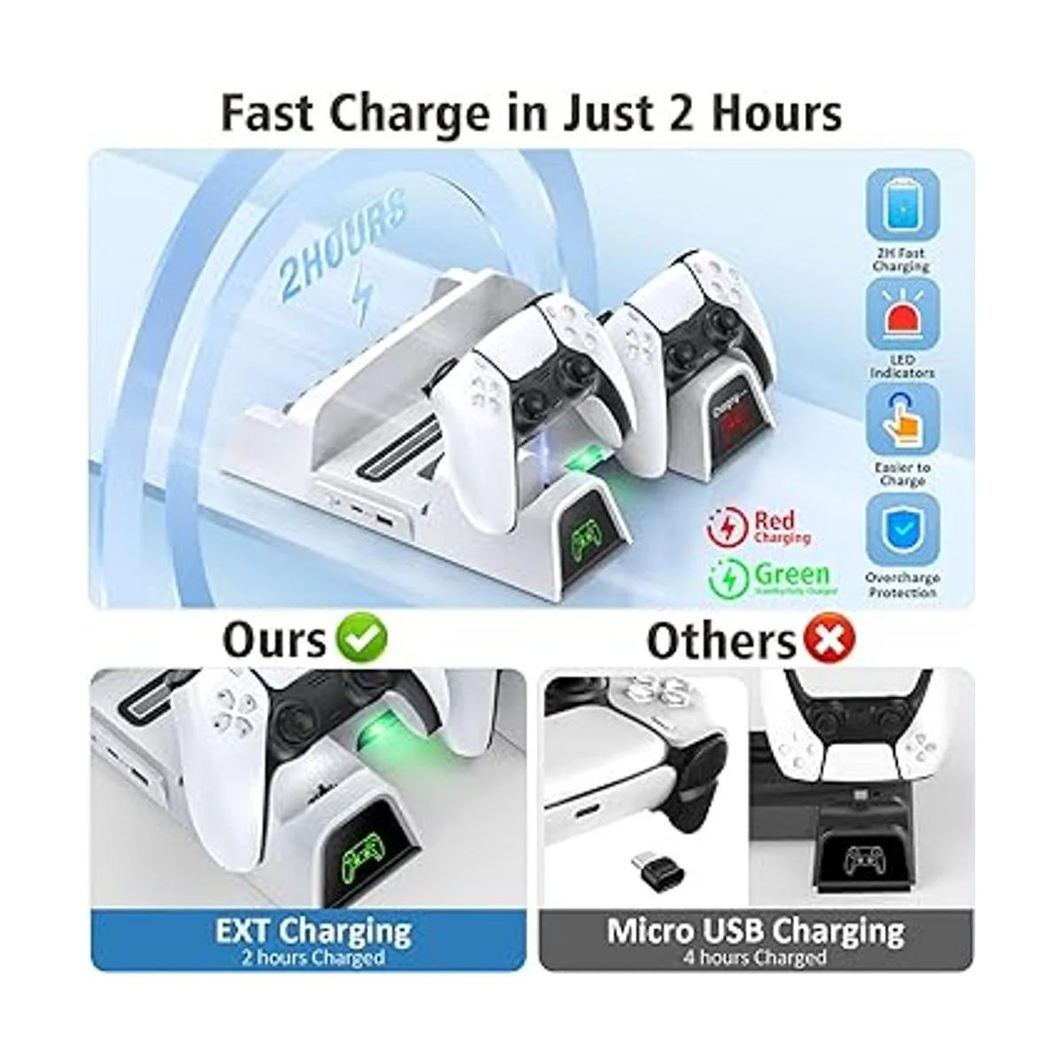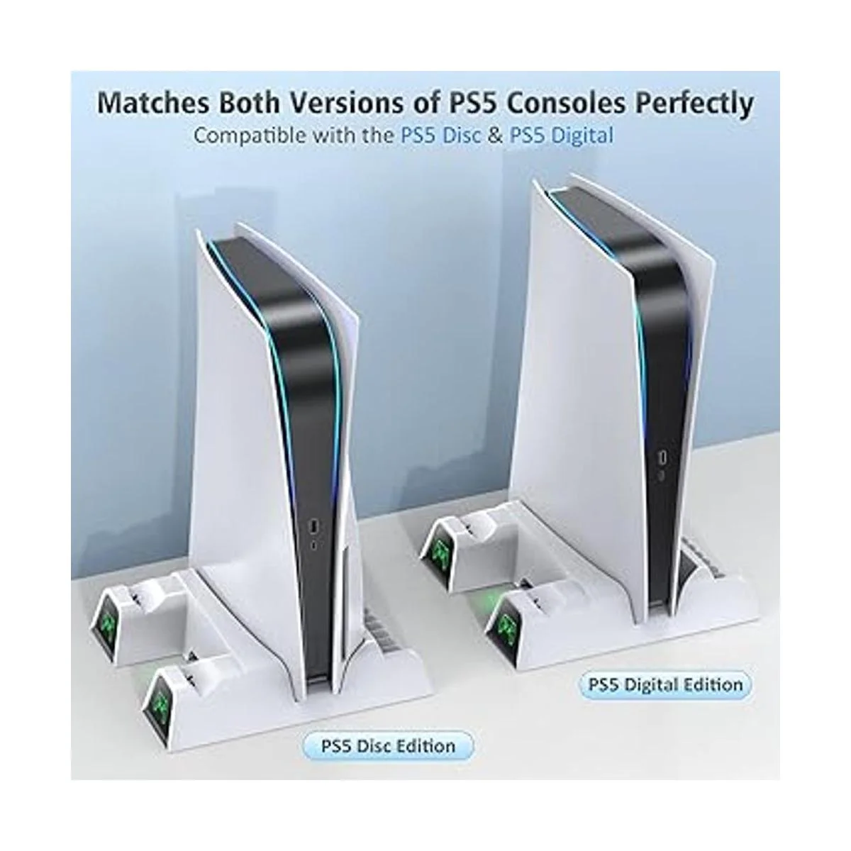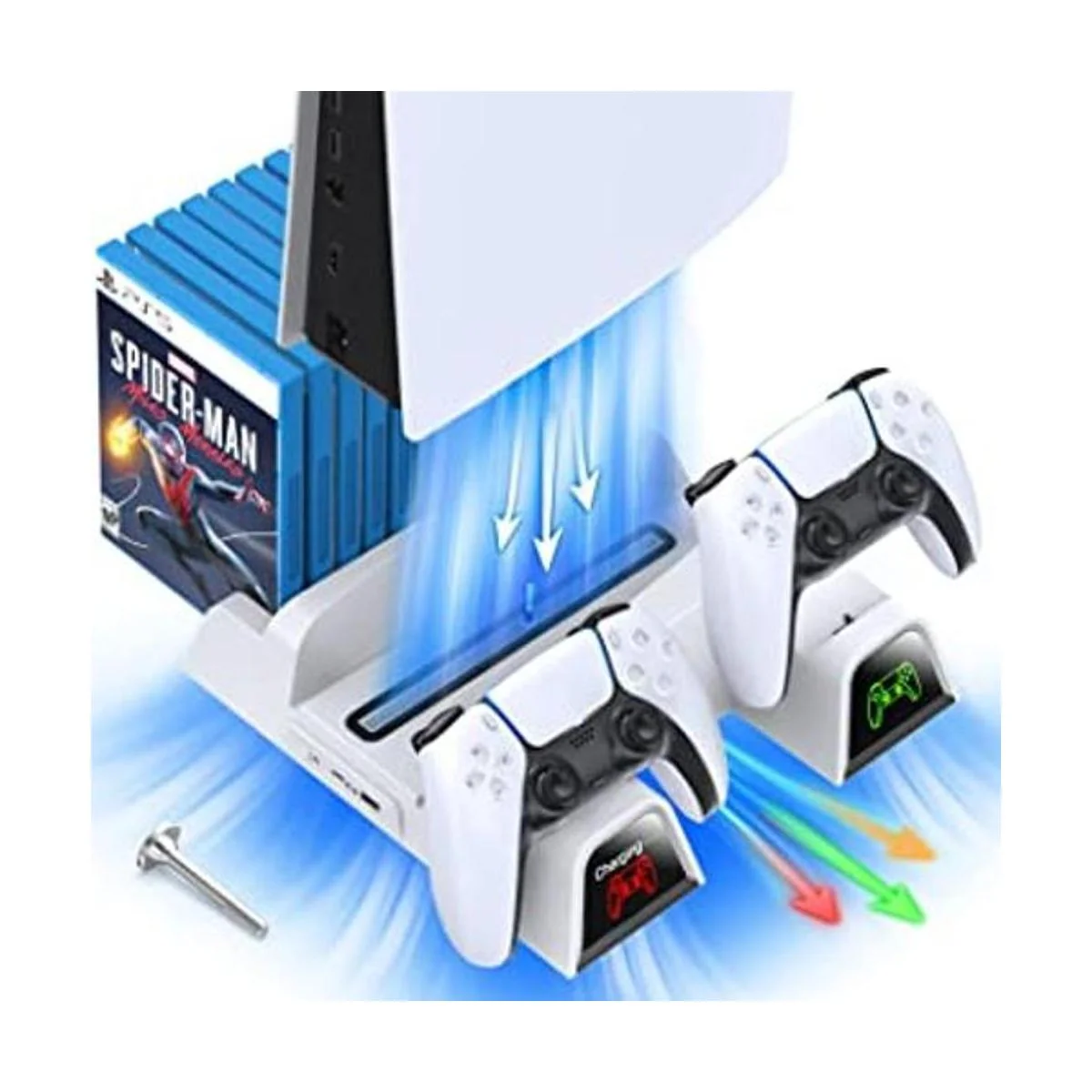 Diseño multifuncional todo en uno para consolas Playstation 5 edición digital y edición de disco: este soporte de refrigeración PS5 con ventiladores de refrigeración eficientes y estación de carga dual de controlador PS5, dos puertos USB 2.0, indicadores de carga LED, 12 soportes de juegos PS5, almacenamiento de tornillos, cable USBC 2 en 1, manteniendo todo limpio y ordenado, funcionalidad más rica hace que estos accesorios PS5 sean un mejor reemplazo para carga oficial del fabricante de PS5 .