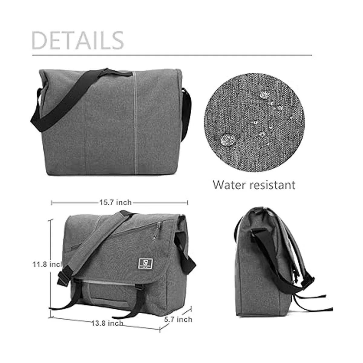 Bolsa de mensajero LOPtop: el tamaño de la bolsa de mensajero para mujer es de 13.8 pulgadas de largo x 5.7 pulgadas de ancho x 11.8 pulgadas de alto. Peso: 1.3 libras. Material: poliéster resistente al agua. Capacidad: 15 L. Es una bolsa de hombro unisex de lona ideal para el trabajo, viajes cortos y uso diario.