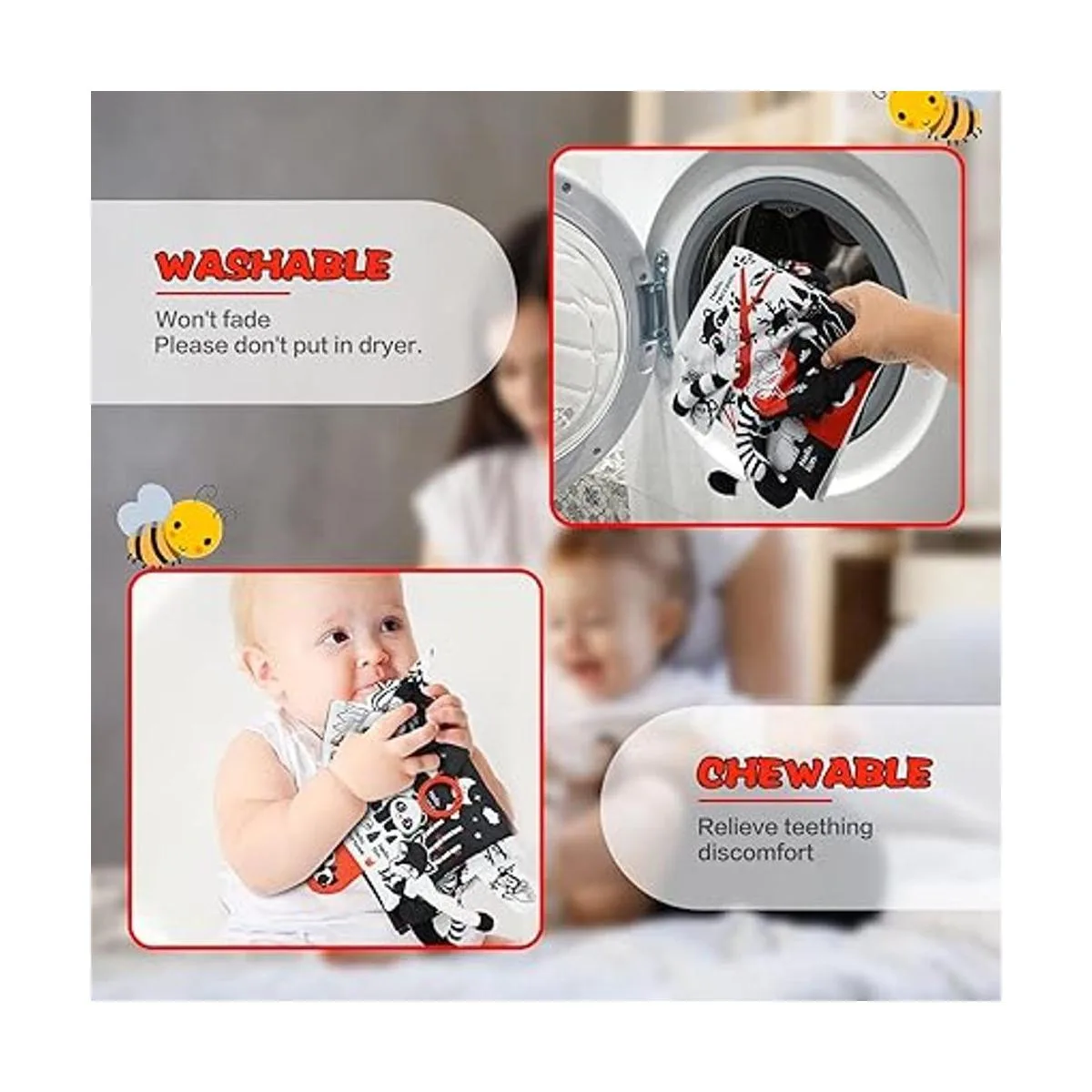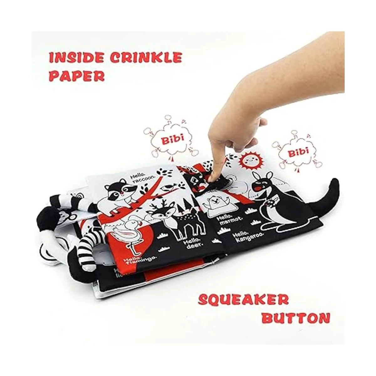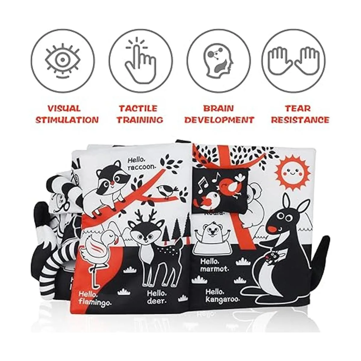 BABYS FIRST BOOK: Baby boys and girls gonna love this high contrast tails book, this soft book is in 3 colors of black, white and red, which is good for newborns eyesight development. Rustling sound from the crinkle paper and squeaky sound from the squeaker button inside the cloth book attract babys attention easily.