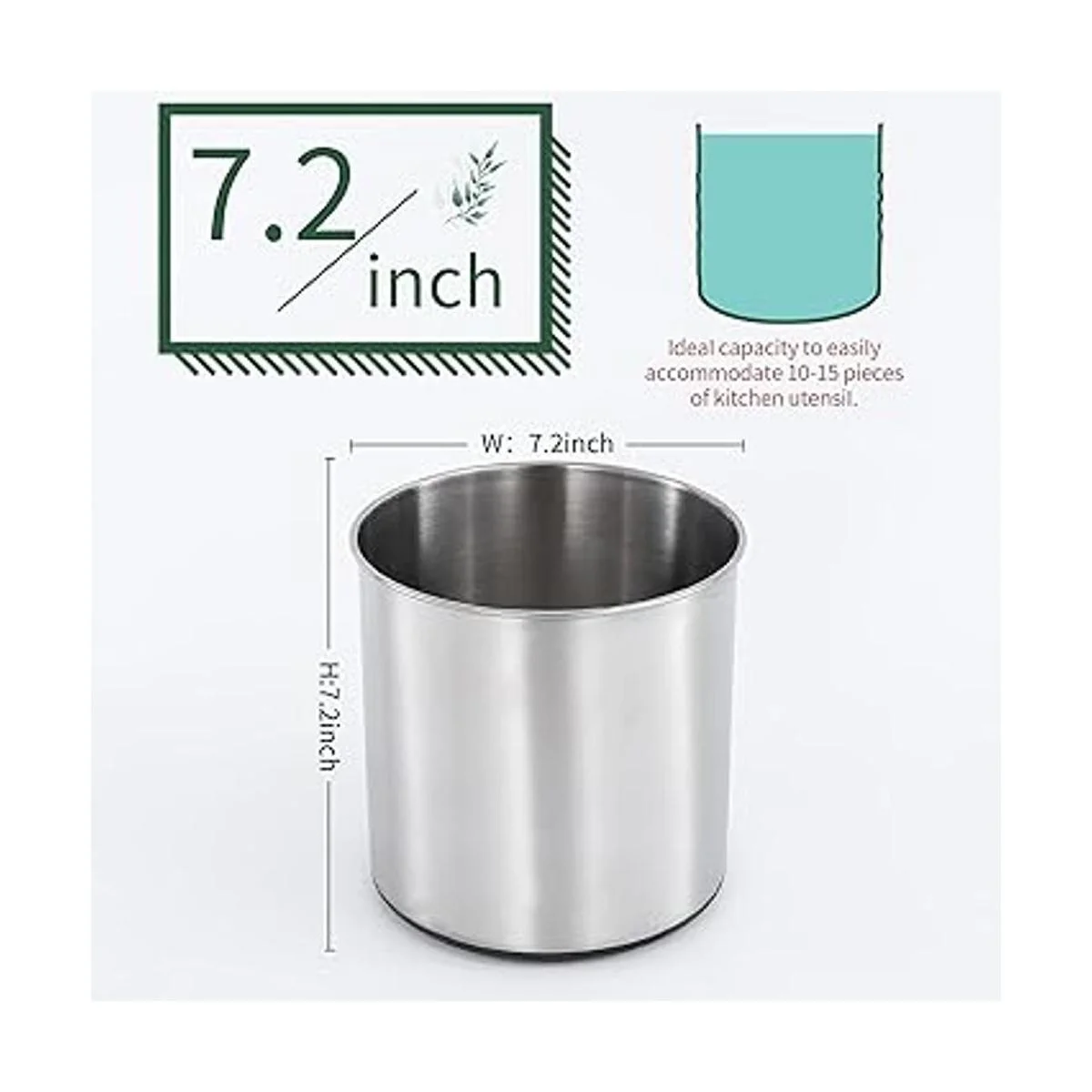 Dimensiones de 7.2 in y 7.2 in de altura. El soporte para utensilios de cocina es lo suficientemente grande y profundo como para almacenar todo un montón de tus herramientas de cocina mientras las mantiene accesibles y verticales. Es lo suficientemente ancho como para contener fácilmente de 10 a 20 utensilios, y lo suficientemente alto como para dar a la taza suficiente apoyo para evitar que se caiga.