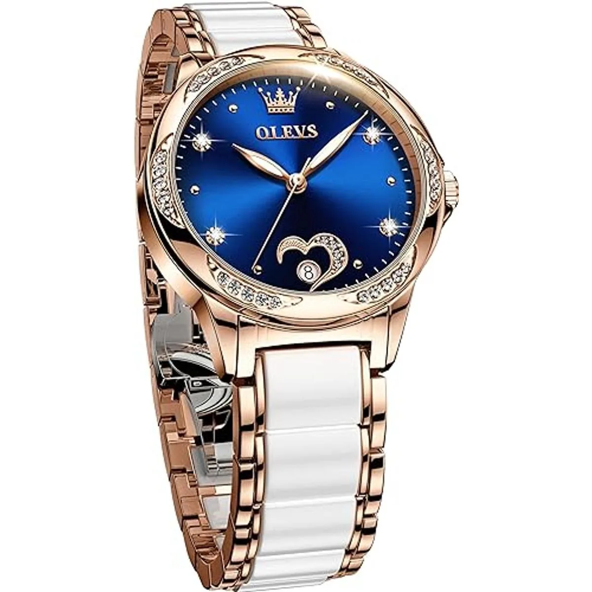 OLEVS Relojes automáticos para mujer, con diamantes de oro rosa, vestido de moda para mujer, reloj de cerámica de dos tonos, con fecha de corazón