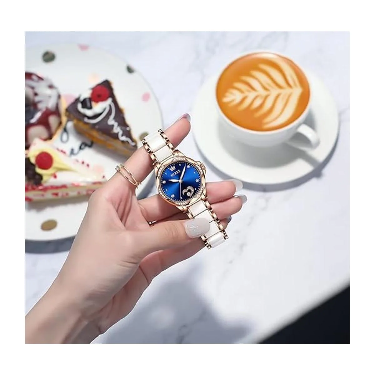 Relojes de cerámica blanca: correa de cerámica de dos tonos de oro rosa brillante y cómodo, suave al tacto. La multifunción incluye 98.4 ft impermeable y luminoso, apto para relojes diarios de mujer excepto nadar.