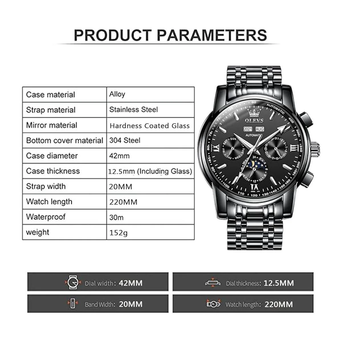 Tamaños estándar : diámetro del espejo del reloj de cuerda automática de 1.654 in, grosor de la caja de metal redonda de 0.492 in, longitud de la pulsera de acero inoxidable: 8.661 in, ancho: 0.787 in, peso: 5.36 oz, resistente al agua hasta 98.4 ft