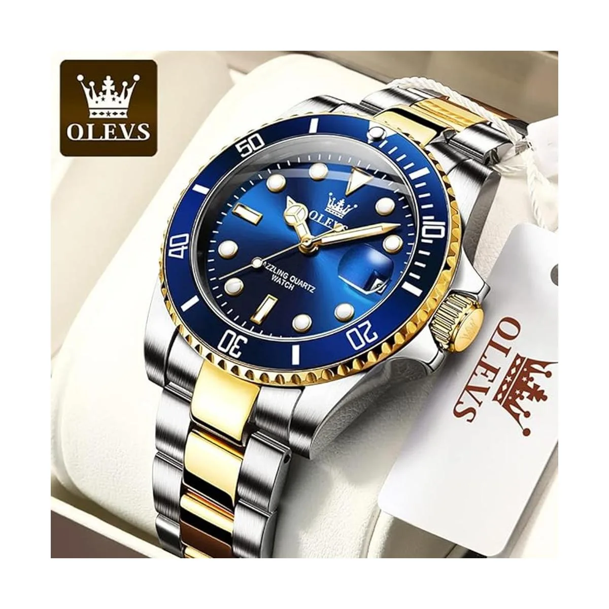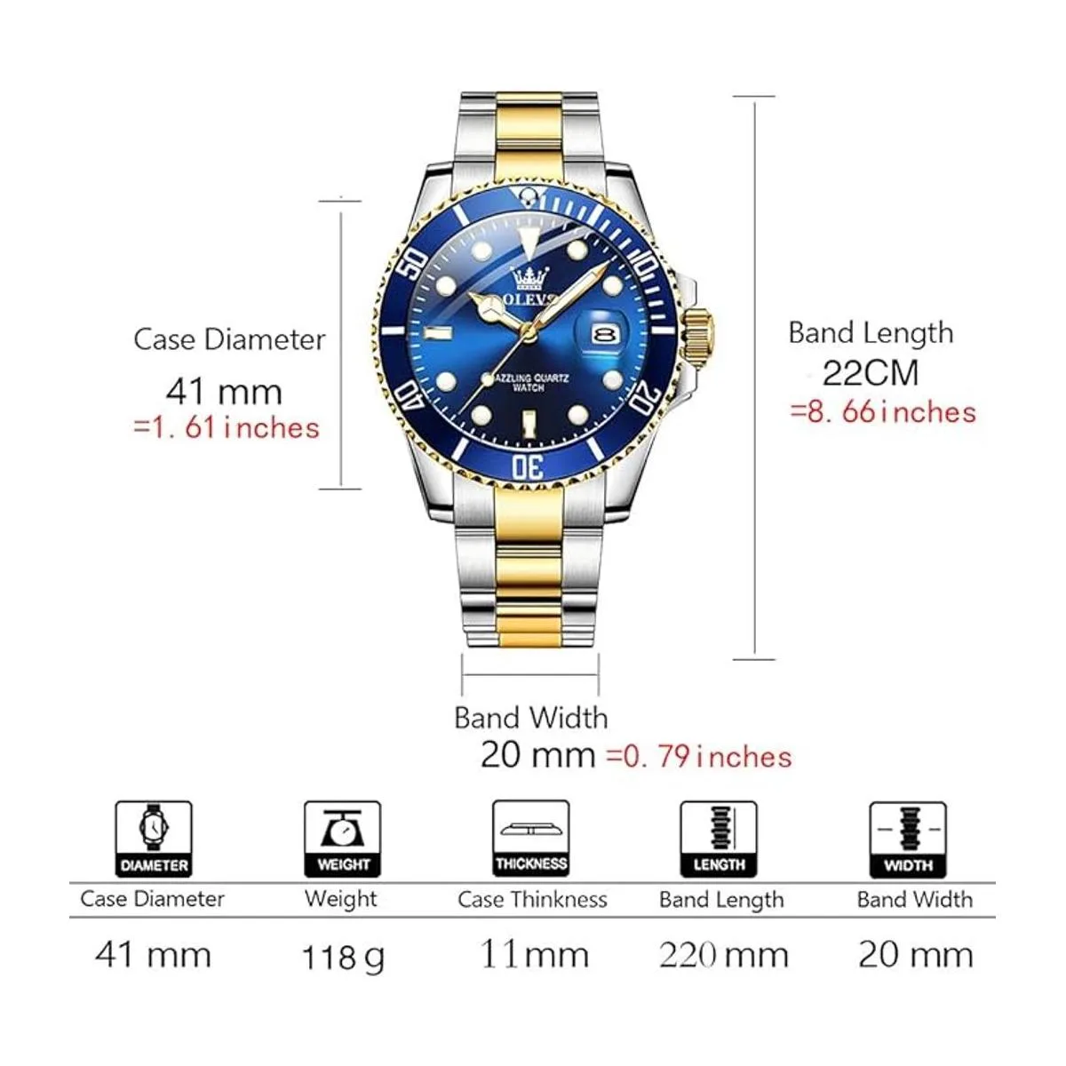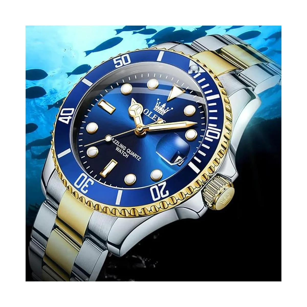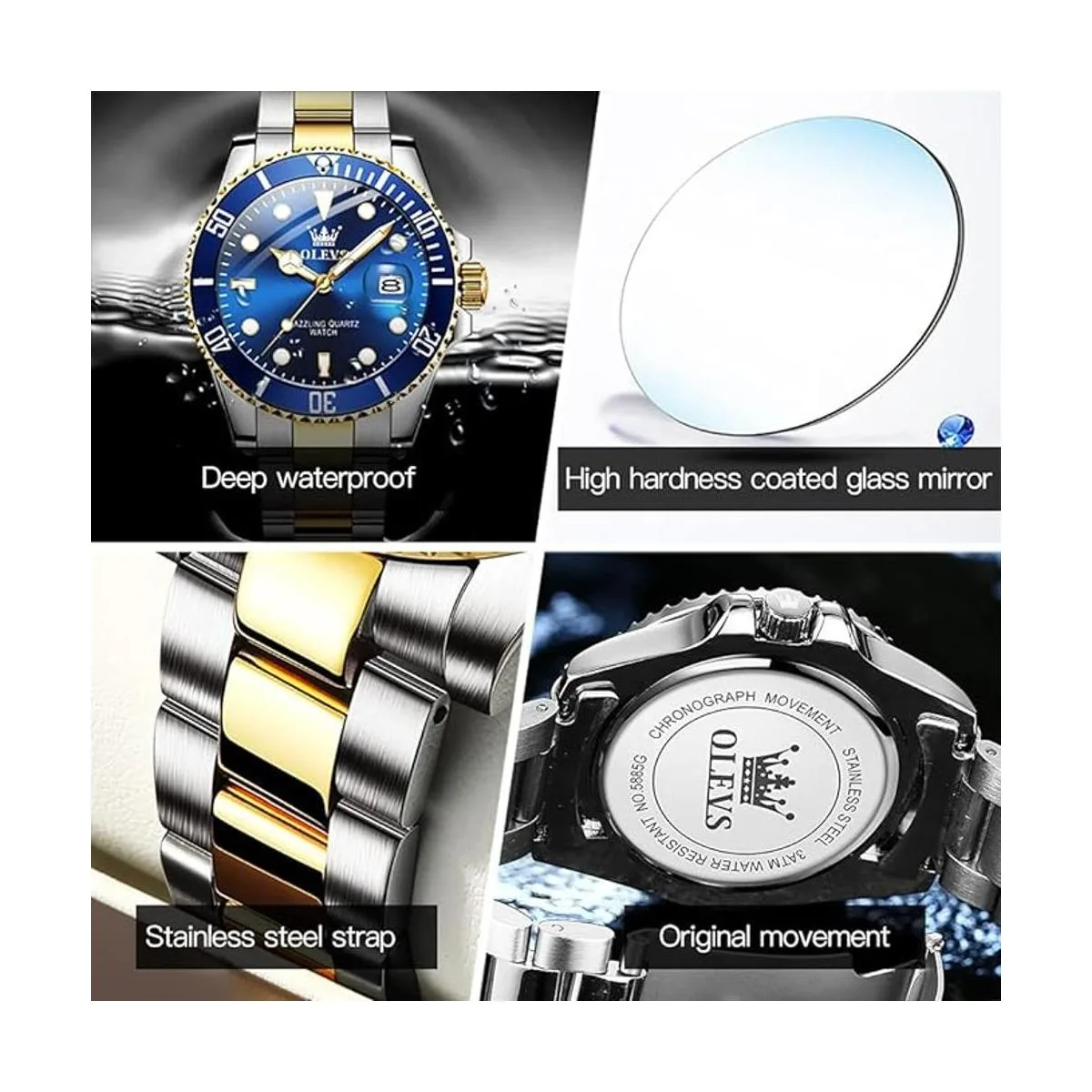 Características Reloj de moda para hombre azul dorado con fecha, resistente al agua apto para nadar, pero no para buceo profundo, no presiones ningún botón bajo el agua, reloj redondo para hombre grande, estilo de lujo. Relojes luminosos para hombre, fácil de leer