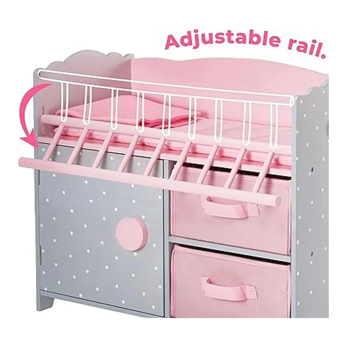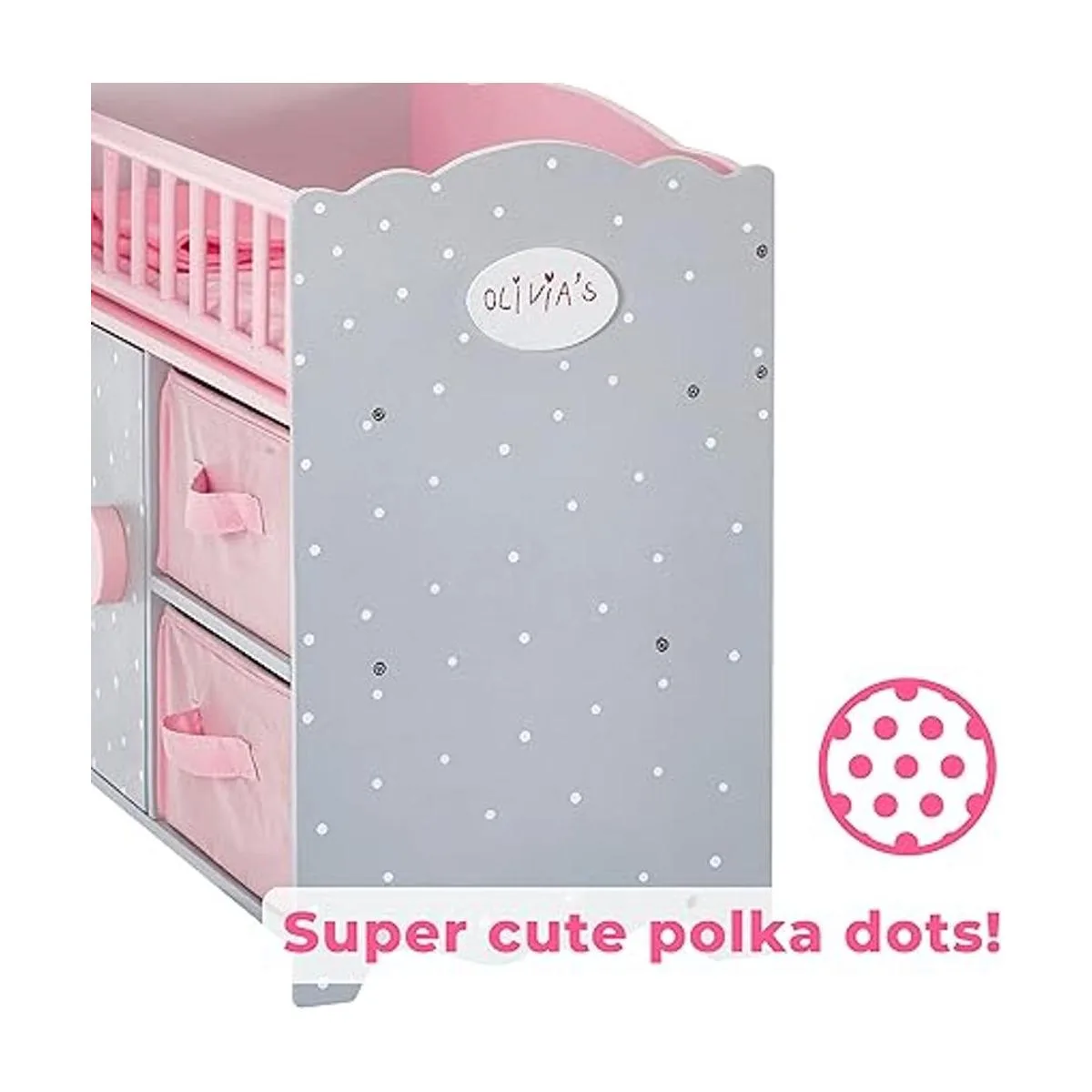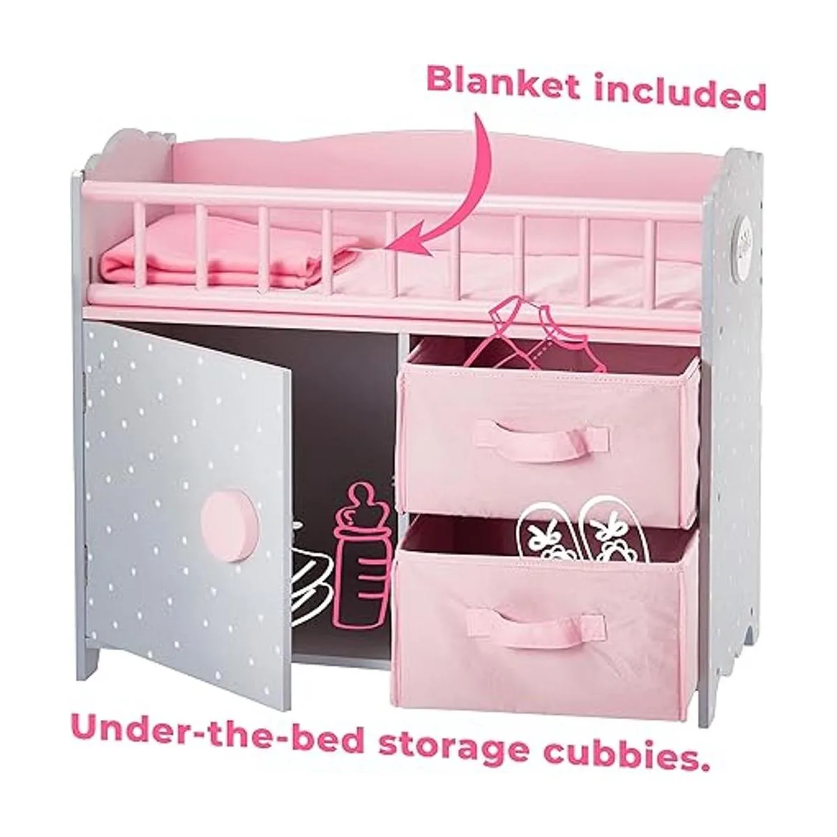 Olivias Little World Cuna de muñeca con manta, riel ajustable, contenedores de tela y almacenamiento debajo de la cama para ropa y accesorios de muñeca, rosagris