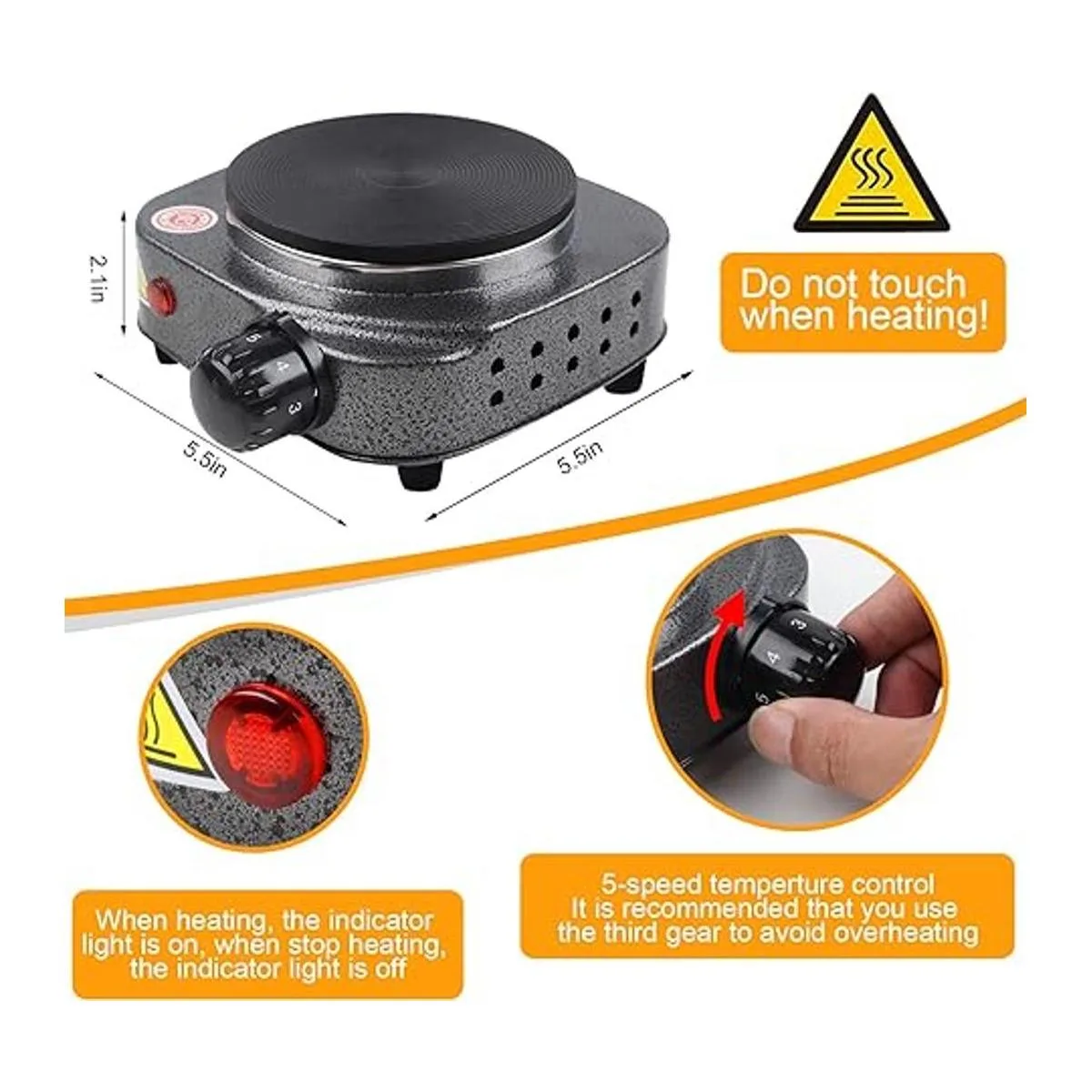 Placa caliente constante: control de temperatura ajustable de 1 a 5 ajustes, 500 vatios de potencia, calentamiento más rápido. El indicador de alimentación iluminado te permite saber si tu quemador está encendido o listo para usar. El indicador de alimentación se ilumina cuando se calienta y se apaga cuando se alcanza la temperatura deseada. Cambiará el interruptor para mantener la temperatura.