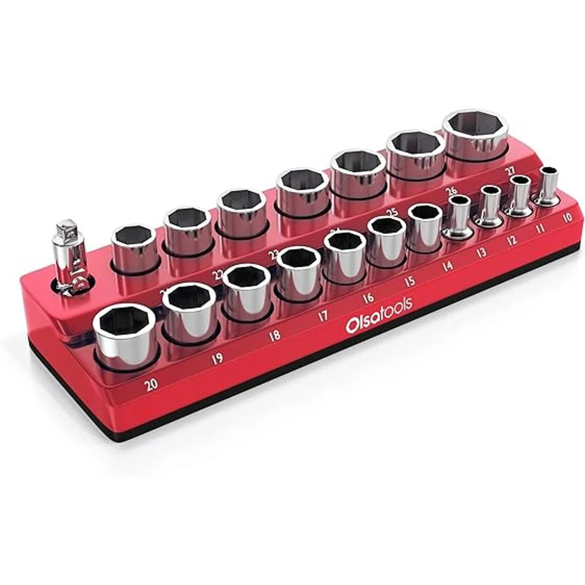 Olsa Tools Soporte magnético para enchufe Unidad de 12 pulgada Métrico Rojo Capacidad para 19 enchufes Organizador de herramientas de calidad profesional