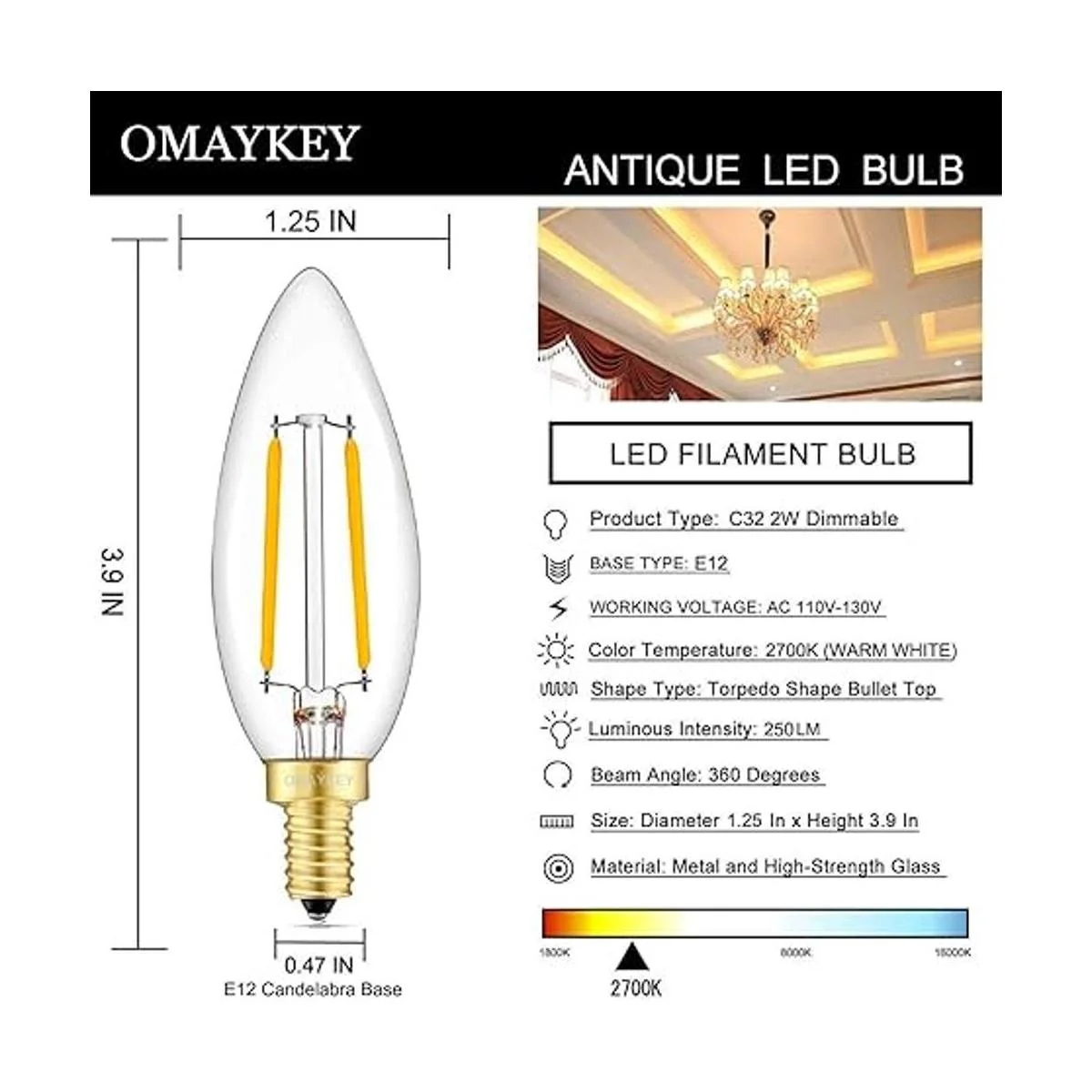 Características del producto: utiliza chips LED de alta eficiencia y alto brillo en filamentos, intensidad luminosa de 250 lúmenes, CA 110130 V, base de candelabro E12, con protección de sobrecarga, protección contra cortocircuitos y protección contra sobretemperatura