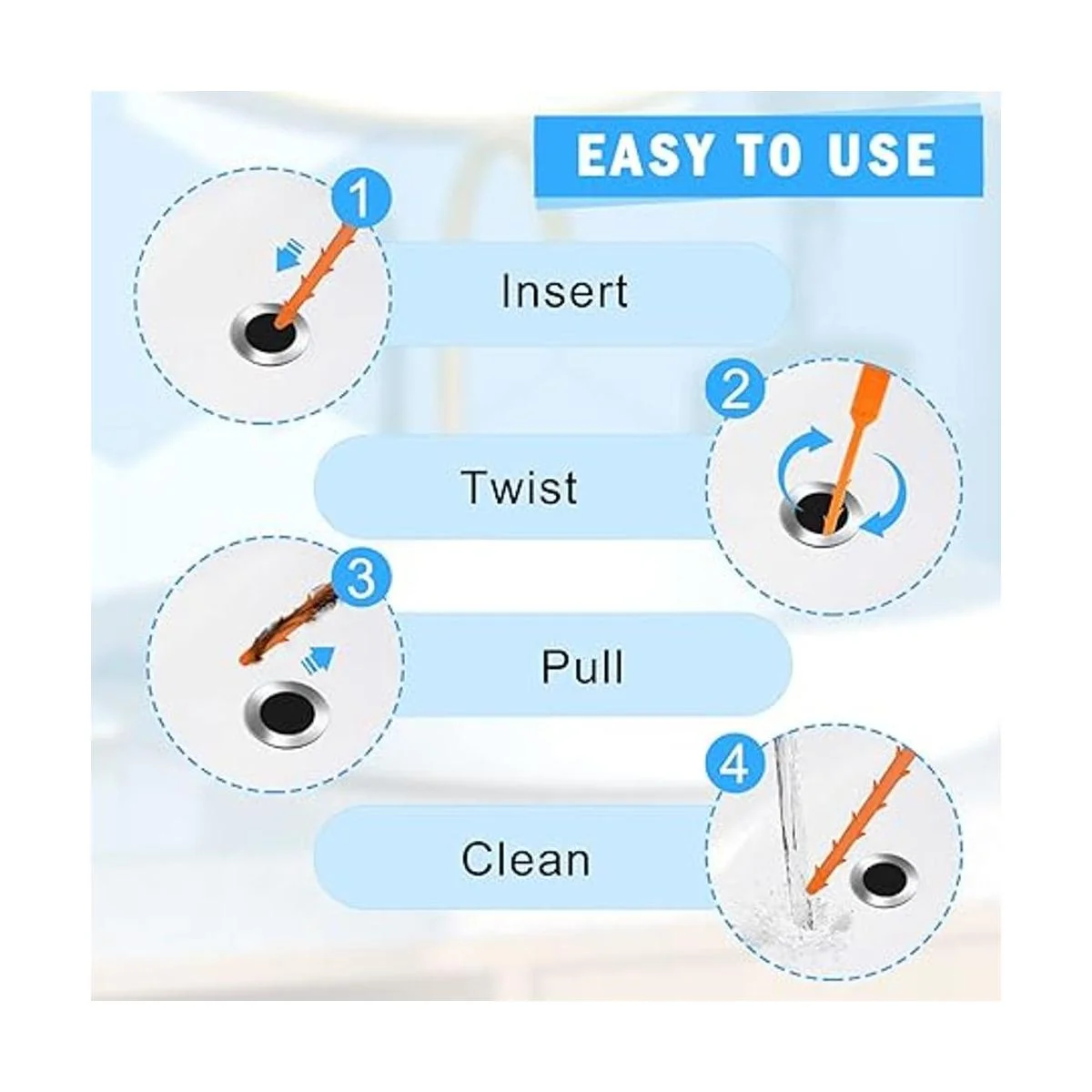 Fácil de usar La herramienta de limpieza de obstrucciones de drenaje de plástico de 5 dientes es simplemente de usar, simplemente sujeta el asa de la empuñadura, inserta, tira de él de arriba y abajo y gira unas cuantas veces hasta que elimine los atascos roten, mientras que las 2 herramientas de metal para agarrar el pelo de manera eficiente y rápida de las tuberías mientras mantiene tus tuberías seguras.