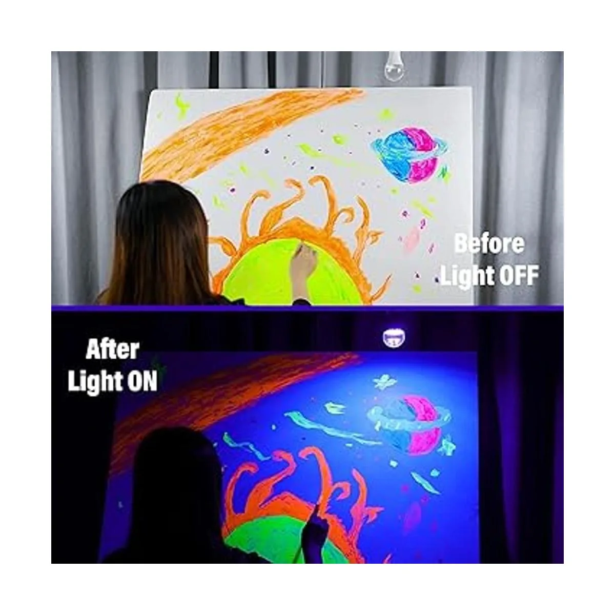 Potentes bombillas de luz negra: equivalente a 75 W, con 18 LED de luz negra de alta calidad y ángulo de haz amplio de 270 grados, esta bombilla negra puede lanzar luz brillante y maravillosa a objetos brillantes de neón, creando un ambiente impresionante que no quieres perderte.