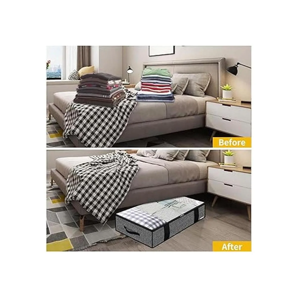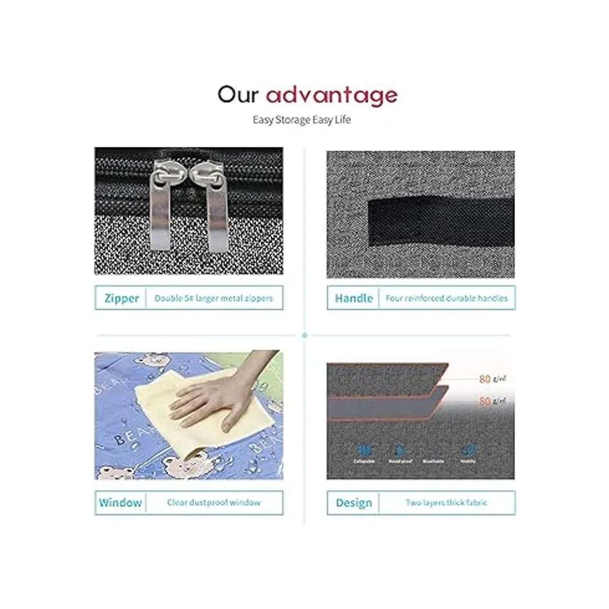 Cuatro asas duraderas: 2 asas frontales y 2 laterales reforzadas hacen que sea fácil y cómodo de llevar y sacar de debajo de la cama. También puedes plegar esta bolsa de almacenamiento para ahorrar espacio cuando no esté en uso.