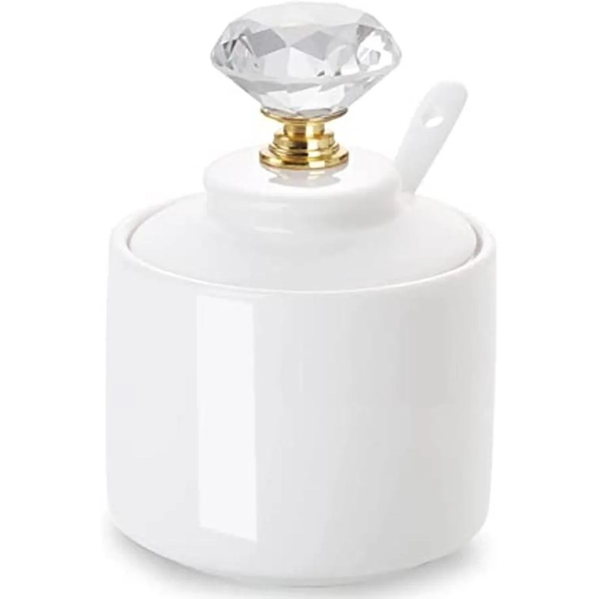 ONTUBE Azucarero de porcelana con tapa de cristal y cuchara, 8 onzas, blanco cristal dorado