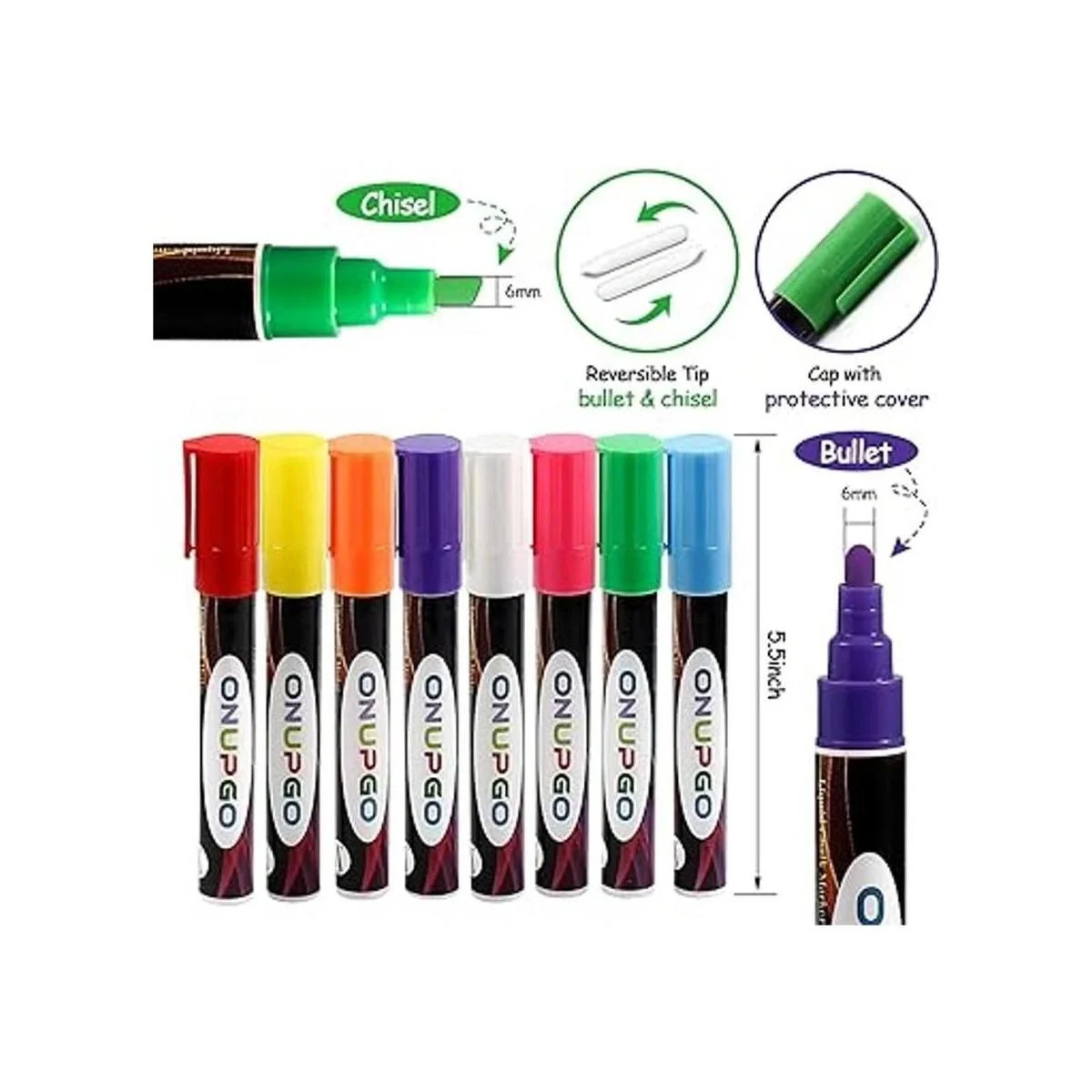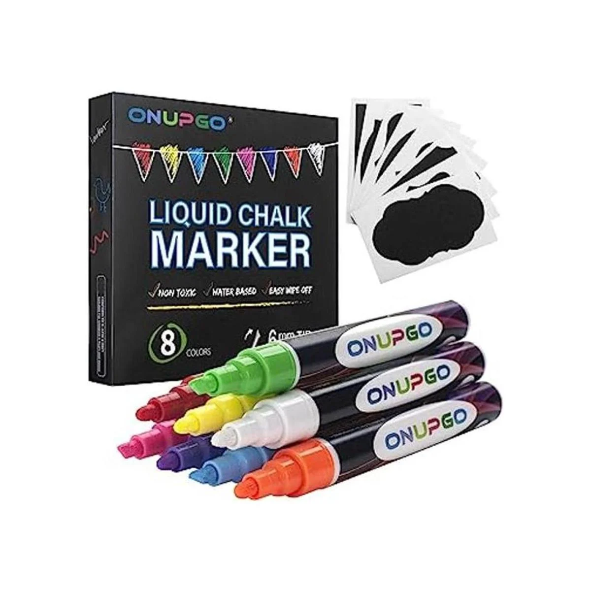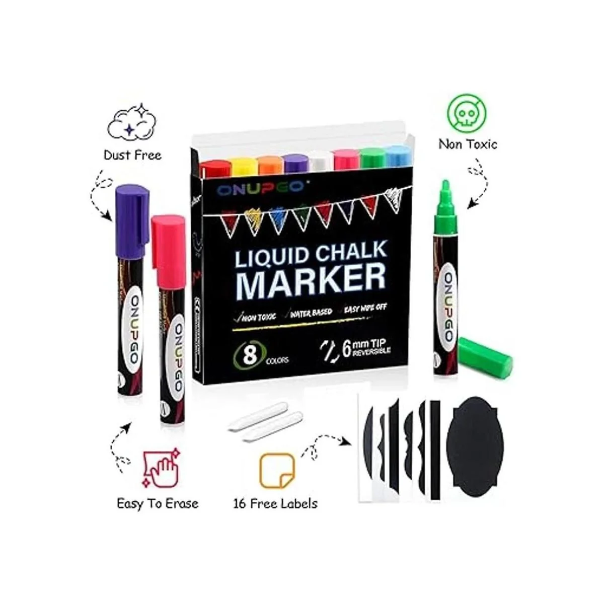 ONUPGO Marcadores de tiza líquida, paquete de 8 bolígrafos de tiza borrables para pizarras de pizarra, vidrio, arte infantil, tablas de menú bistró, 16 etiquetas de pizarra incluidas, punta reversible de 0.236 in