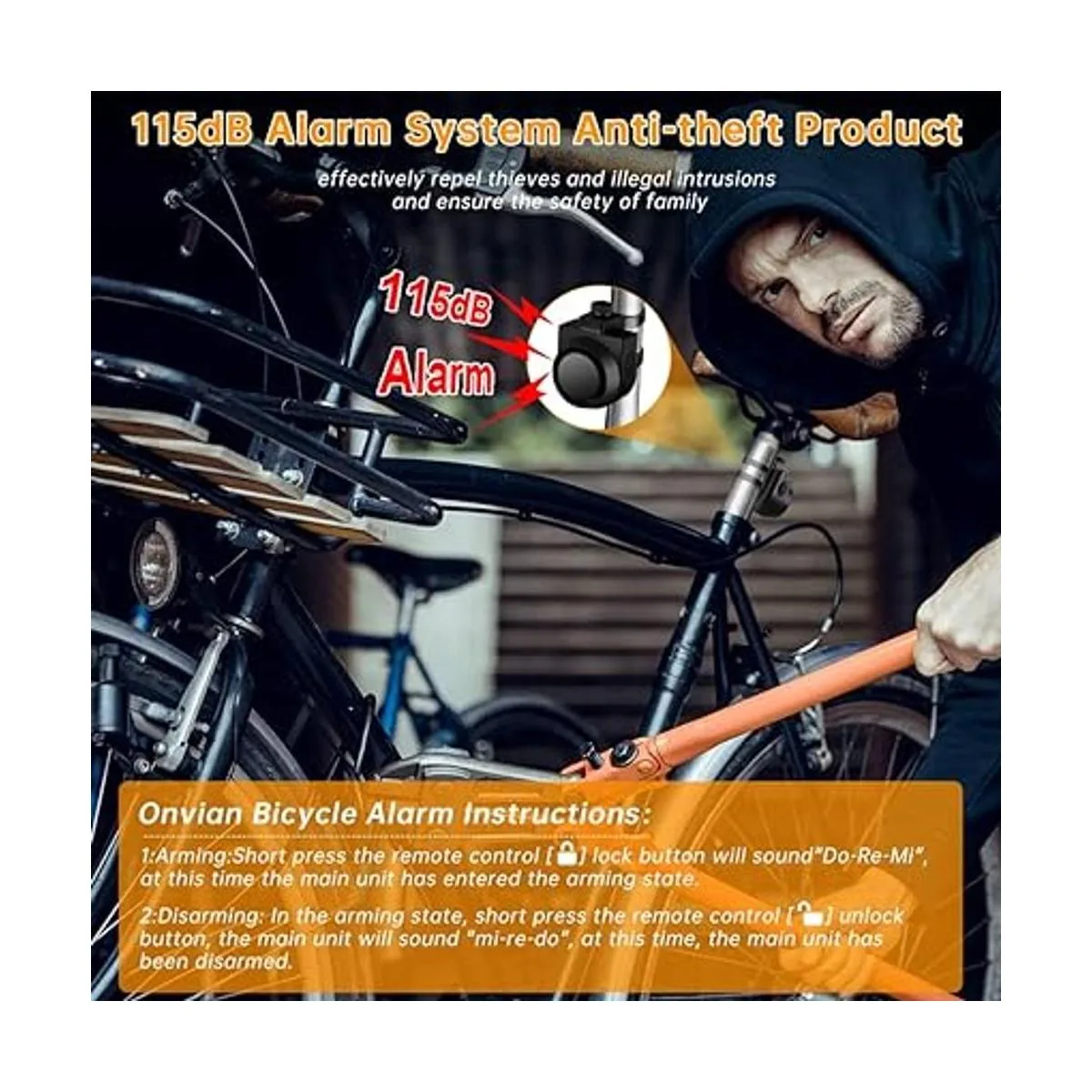Onvian Alarma de bicicleta de 115 dB con control remoto, sistemas de alarma antirrobo inalámbrica recargable por USB, para motocicleta, bicicleta, scooter, coche, detección de movimiento sensible, alarma de seguridad para bicicleta de volumen, ajustable